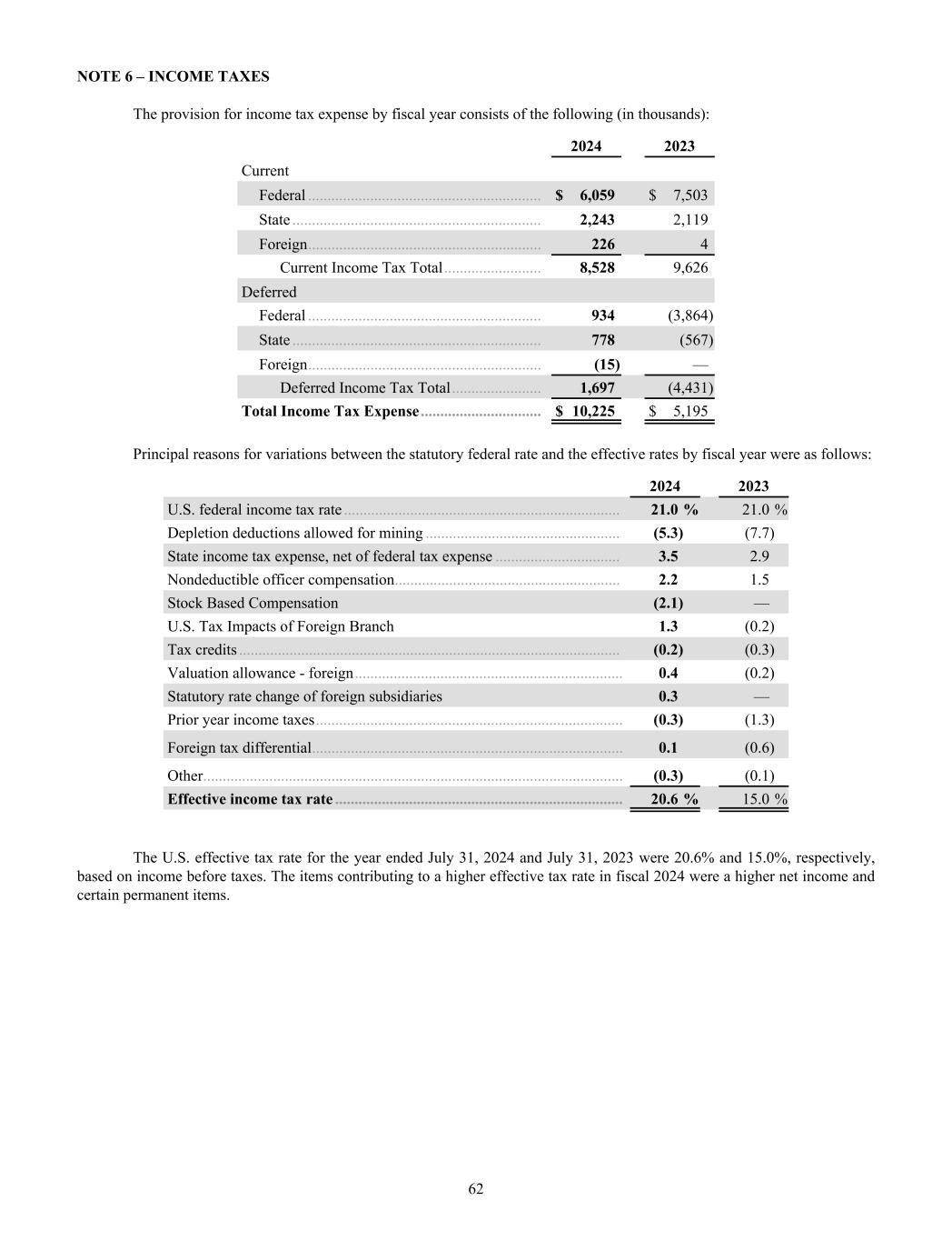NOTE 6 – INCOME TAXES The provision for income tax expense by fiscal year consists of the following (in thousands): 2024 2023 Current Federal ............................................................ $ 6,059 $ 7,503 State ................................................................ 2,243 2,119 Foreign ............................................................ 226 4 Current Income Tax Total ......................... 8,528 9,626 Deferred Federal ............................................................ 934 (3,864) State ................................................................ 778 (567) Foreign ............................................................ (15) — Deferred Income Tax Total ....................... 1,697 (4,431) Total Income Tax Expense ............................... $ 10,225 $ 5,195 Principal reasons for variations between the statutory federal rate and the effective rates by fiscal year were as follows: 2024 2023 U.S. federal income tax rate ....................................................................... 21.0 % 21.0 % Depletion deductions allowed for mining .................................................. (5.3) (7.7) State income tax expense, net of federal tax expense ................................ 3.5 2.9 Nondeductible officer compensation .......................................................... 2.2 1.5 Stock Based Compensation (2.1) — U.S. Tax Impacts of Foreign Branch 1.3 (0.2) Tax credits .................................................................................................. (0.2) (0.3) Valuation allowance - foreign ..................................................................... 0.4 (0.2) Statutory rate change of foreign subsidiaries 0.3 — Prior year income taxes ............................................................................... (0.3) (1.3) Foreign tax differential ................................................................................ 0.1 (0.6) Other ............................................................................................................ (0.3) (0.1) Effective income tax rate .......................................................................... 20.6 % 15.0 % The U.S. effective tax rate for the year ended July 31, 2024 and July 31, 2023 were 20.6% and 15.0%, respectively, based on income before taxes. The items contributing to a higher effective tax rate in fiscal 2024 were a higher net income and certain permanent items. 62