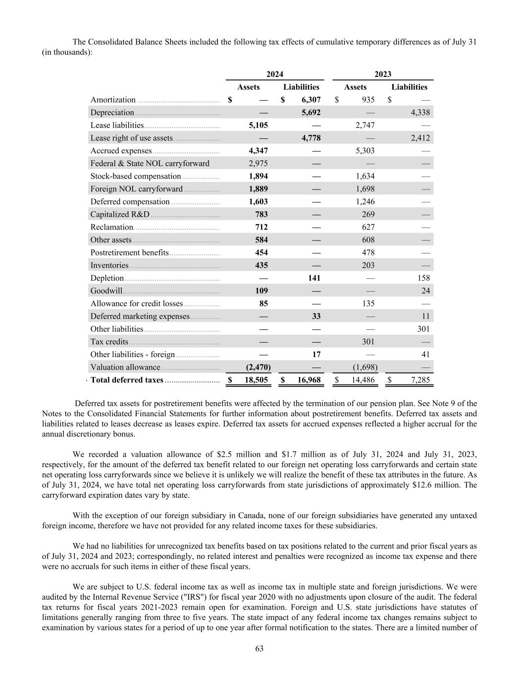 The Consolidated Balance Sheets included the following tax effects of cumulative temporary differences as of July 31 (in thousands): ` 2024 2023 Assets Liabilities Assets Liabilities Amortization ....................................... $ — $ 6,307 $ 935 $ — Depreciation ........................................ — 5,692 — 4,338 Lease liabilities .................................... 5,105 — 2,747 — Lease right of use assets ...................... — 4,778 — 2,412 Accrued expenses ................................ 4,347 — 5,303 — Federal & State NOL carryforward 2,975 — — — Stock-based compensation .................. 1,894 — 1,634 — Foreign NOL carryforward ................. 1,889 — 1,698 — Deferred compensation ....................... 1,603 — 1,246 — Capitalized R&D ................................. 783 — 269 — Reclamation ......................................... 712 — 627 — Other assets ......................................... 584 — 608 — Postretirement benefits ........................ 454 — 478 — Inventories ........................................... 435 — 203 — Depletion ............................................. — 141 — 158 Goodwill .............................................. 109 — — 24 Allowance for credit losses ................. 85 — 135 — Deferred marketing expenses .............. — 33 — 11 Other liabilities .................................... — — — 301 Tax credits ........................................... — — 301 — Other liabilities - foreign ..................... — 17 — 41 Valuation allowance ............................ (2,470) — (1,698) — Total deferred taxes .......................... $ 18,505 $ 16,968 $ 14,486 $ 7,285 Deferred tax assets for postretirement benefits were affected by the termination of our pension plan. See Note 9 of the Notes to the Consolidated Financial Statements for further information about postretirement benefits. Deferred tax assets and liabilities related to leases decrease as leases expire. Deferred tax assets for accrued expenses reflected a higher accrual for the annual discretionary bonus. We recorded a valuation allowance of $2.5 million and $1.7 million as of July 31, 2024 and July 31, 2023, respectively, for the amount of the deferred tax benefit related to our foreign net operating loss carryforwards and certain state net operating loss carryforwards since we believe it is unlikely we will realize the benefit of these tax attributes in the future. As of July 31, 2024, we have total net operating loss carryforwards from state jurisdictions of approximately $12.6 million. The carryforward expiration dates vary by state. With the exception of our foreign subsidiary in Canada, none of our foreign subsidiaries have generated any untaxed foreign income, therefore we have not provided for any related income taxes for these subsidiaries. We had no liabilities for unrecognized tax benefits based on tax positions related to the current and prior fiscal years as of July 31, 2024 and 2023; correspondingly, no related interest and penalties were recognized as income tax expense and there were no accruals for such items in either of these fiscal years. We are subject to U.S. federal income tax as well as income tax in multiple state and foreign jurisdictions. We were audited by the Internal Revenue Service ("IRS") for fiscal year 2020 with no adjustments upon closure of the audit. The federal tax returns for fiscal years 2021-2023 remain open for examination. Foreign and U.S. state jurisdictions have statutes of limitations generally ranging from three to five years. The state impact of any federal income tax changes remains subject to examination by various states for a period of up to one year after formal notification to the states. There are a limited number of 63