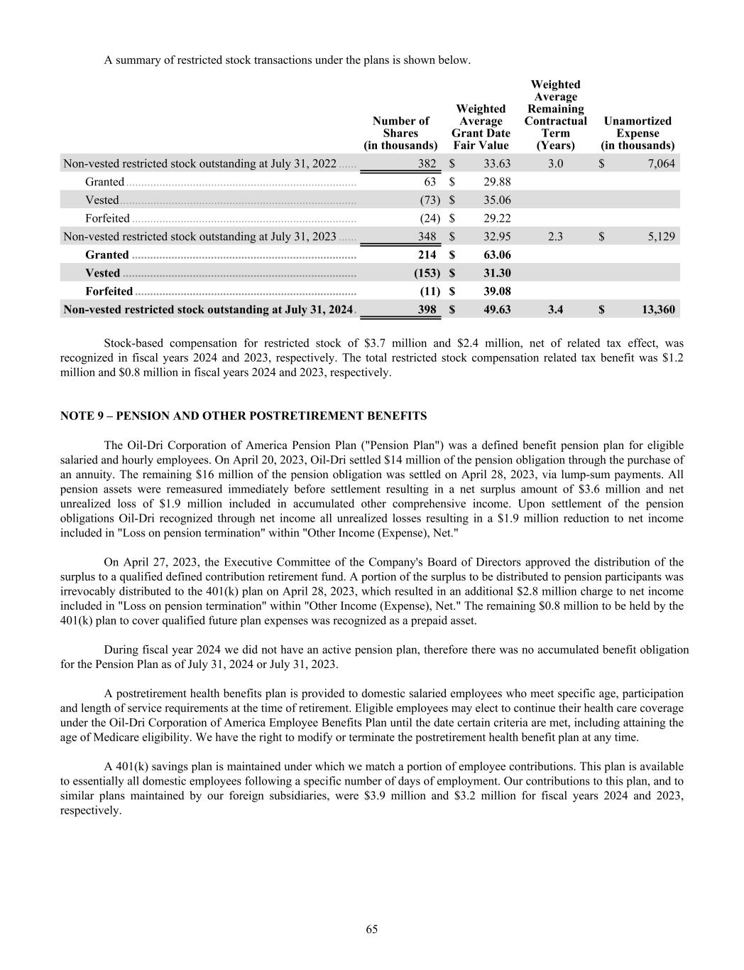 A summary of restricted stock transactions under the plans is shown below. Number of Shares (in thousands) Weighted Average Grant Date Fair Value Weighted Average Remaining Contractual Term (Years) Unamortized Expense (in thousands) Non-vested restricted stock outstanding at July 31, 2022 ...... 382 $ 33.63 3.0 $ 7,064 Granted ............................................................................ 63 $ 29.88 Vested .............................................................................. (73) $ 35.06 Forfeited .......................................................................... (24) $ 29.22 Non-vested restricted stock outstanding at July 31, 2023 ...... 348 $ 32.95 2.3 $ 5,129 Granted .......................................................................... 214 $ 63.06 Vested ............................................................................. (153) $ 31.30 Forfeited ......................................................................... (11) $ 39.08 Non-vested restricted stock outstanding at July 31, 2024 . 398 $ 49.63 3.4 $ 13,360 Stock-based compensation for restricted stock of $3.7 million and $2.4 million, net of related tax effect, was recognized in fiscal years 2024 and 2023, respectively. The total restricted stock compensation related tax benefit was $1.2 million and $0.8 million in fiscal years 2024 and 2023, respectively. NOTE 9 – PENSION AND OTHER POSTRETIREMENT BENEFITS The Oil-Dri Corporation of America Pension Plan ("Pension Plan") was a defined benefit pension plan for eligible salaried and hourly employees. On April 20, 2023, Oil-Dri settled $14 million of the pension obligation through the purchase of an annuity. The remaining $16 million of the pension obligation was settled on April 28, 2023, via lump-sum payments. All pension assets were remeasured immediately before settlement resulting in a net surplus amount of $3.6 million and net unrealized loss of $1.9 million included in accumulated other comprehensive income. Upon settlement of the pension obligations Oil-Dri recognized through net income all unrealized losses resulting in a $1.9 million reduction to net income included in "Loss on pension termination" within "Other Income (Expense), Net." On April 27, 2023, the Executive Committee of the Company's Board of Directors approved the distribution of the surplus to a qualified defined contribution retirement fund. A portion of the surplus to be distributed to pension participants was irrevocably distributed to the 401(k) plan on April 28, 2023, which resulted in an additional $2.8 million charge to net income included in "Loss on pension termination" within "Other Income (Expense), Net." The remaining $0.8 million to be held by the 401(k) plan to cover qualified future plan expenses was recognized as a prepaid asset. During fiscal year 2024 we did not have an active pension plan, therefore there was no accumulated benefit obligation for the Pension Plan as of July 31, 2024 or July 31, 2023. A postretirement health benefits plan is provided to domestic salaried employees who meet specific age, participation and length of service requirements at the time of retirement. Eligible employees may elect to continue their health care coverage under the Oil-Dri Corporation of America Employee Benefits Plan until the date certain criteria are met, including attaining the age of Medicare eligibility. We have the right to modify or terminate the postretirement health benefit plan at any time. A 401(k) savings plan is maintained under which we match a portion of employee contributions. This plan is available to essentially all domestic employees following a specific number of days of employment. Our contributions to this plan, and to similar plans maintained by our foreign subsidiaries, were $3.9 million and $3.2 million for fiscal years 2024 and 2023, respectively. 65