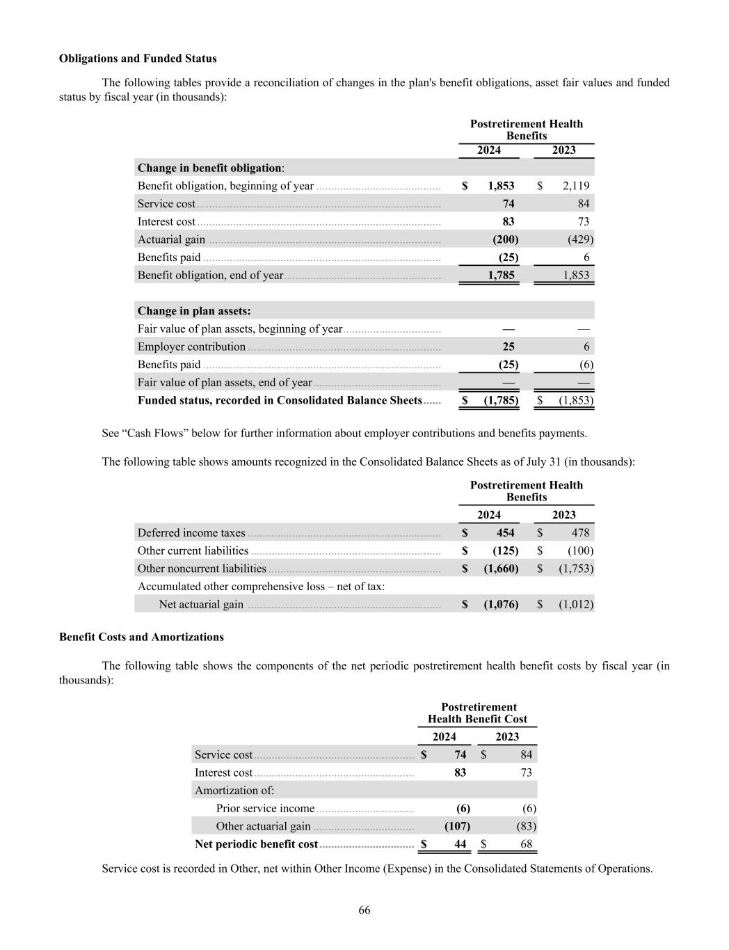 The following tables provide a reconciliation of changes in the plan's benefit obligations, asset fair values and funded status by fiscal year (in thousands): Postretirement Health Benefits 2024 2023 Change in benefit obligation: Benefit obligation, beginning of year .......................................... $ 1,853 $ 2,119 Service cost .................................................................................. 74 84 Interest cost .................................................................................. 83 73 Actuarial gain .............................................................................. (200) (429) Benefits paid ................................................................................ (25) 6 Benefit obligation, end of year ..................................................... 1,785 1,853 Change in plan assets: Fair value of plan assets, beginning of year ................................. — — Employer contribution ................................................................. 25 6 Benefits paid ................................................................................ (25) (6) Fair value of plan assets, end of year ........................................... — — Funded status, recorded in Consolidated Balance Sheets ...... $ (1,785) $ (1,853) See “Cash Flows” below for further information about employer contributions and benefits payments. The following table shows amounts recognized in the Consolidated Balance Sheets as of July 31 (in thousands): Postretirement Health Benefits 2024 2023 Deferred income taxes ................................................................. $ 454 $ 478 Other current liabilities ................................................................ $ (125) $ (100) Other noncurrent liabilities .......................................................... $ (1,660) $ (1,753) Accumulated other comprehensive loss – net of tax: Net actuarial gain ................................................................. $ (1,076) $ (1,012) Benefit Costs and Amortizations The following table shows the components of the net periodic postretirement health benefit costs by fiscal year (in thousands): Postretirement Health Benefit Cost 2024 2023 Service cost ...................................................... $ 74 $ 84 Interest cost ...................................................... 83 73 Amortization of: Prior service income ................................. (6) (6) Other actuarial gain .................................. (107) (83) Net periodic benefit cost ................................ $ 44 $ 68 Service cost is recorded in Other, net within Other Income (Expense) in the Consolidated Statements of Operations. 66 Obligations and Funded Status