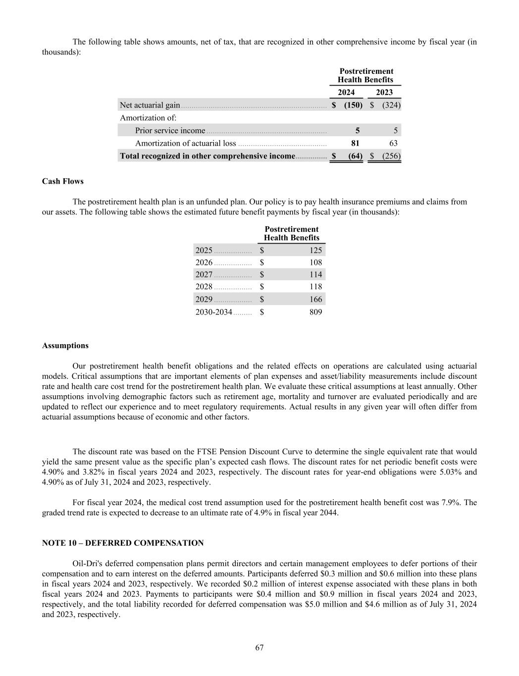 The following table shows amounts, net of tax, that are recognized in other comprehensive income by fiscal year (in thousands): Postretirement Health Benefits 2024 2023 Net actuarial gain ..................................................................... $ (150) $ (324) Amortization of: Prior service income ......................................................... 5 5 Amortization of actuarial loss .......................................... 81 63 Total recognized in other comprehensive income ............... $ (64) $ (256) Cash Flows The postretirement health plan is an unfunded plan. Our policy is to pay health insurance premiums and claims from our assets. The following table shows the estimated future benefit payments by fiscal year (in thousands): Postretirement Health Benefits 2025 .................. $ 125 2026 .................. $ 108 2027 .................. $ 114 2028 .................. $ 118 2029 .................. $ 166 2030-2034 ......... $ 809 Assumptions Our postretirement health benefit obligations and the related effects on operations are calculated using actuarial models. Critical assumptions that are important elements of plan expenses and asset/liability measurements include discount rate and health care cost trend for the postretirement health plan. We evaluate these critical assumptions at least annually. Other assumptions involving demographic factors such as retirement age, mortality and turnover are evaluated periodically and are updated to reflect our experience and to meet regulatory requirements. Actual results in any given year will often differ from actuarial assumptions because of economic and other factors. The discount rate was based on the FTSE Pension Discount Curve to determine the single equivalent rate that would yield the same present value as the specific plan’s expected cash flows. The discount rates for net periodic benefit costs were 4.90% and 3.82% in fiscal years 2024 and 2023, respectively. The discount rates for year-end obligations were 5.03% and 4.90% as of July 31, 2024 and 2023, respectively. For fiscal year 2024, the medical cost trend assumption used for the postretirement health benefit cost was 7.9%. The graded trend rate is expected to decrease to an ultimate rate of 4.9% in fiscal year 2044. NOTE 10 – DEFERRED COMPENSATION Oil-Dri's deferred compensation plans permit directors and certain management employees to defer portions of their compensation and to earn interest on the deferred amounts. Participants deferred $0.3 million and $0.6 million into these plans in fiscal years 2024 and 2023, respectively. We recorded $0.2 million of interest expense associated with these plans in both fiscal years 2024 and 2023. Payments to participants were $0.4 million and $0.9 million in fiscal years 2024 and 2023, respectively, and the total liability recorded for deferred compensation was $5.0 million and $4.6 million as of July 31, 2024 and 2023, respectively. 67