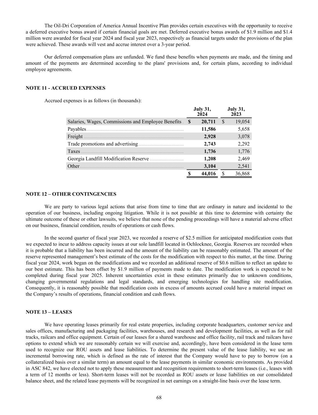 The Oil-Dri Corporation of America Annual Incentive Plan provides certain executives with the opportunity to receive a deferred executive bonus award if certain financial goals are met. Deferred executive bonus awards of $1.9 million and $1.4 million were awarded for fiscal year 2024 and fiscal year 2023, respectively as financial targets under the provisions of the plan were achieved. These awards will vest and accrue interest over a 3-year period. Our deferred compensation plans are unfunded. We fund these benefits when payments are made, and the timing and amount of the payments are determined according to the plans' provisions and, for certain plans, according to individual employee agreements. NOTE 11 - ACCRUED EXPENSES Accrued expenses is as follows (in thousands): July 31, 2024 July 31, 2023 Salaries, Wages, Commissions and Employee Benefits . $ 20,711 $ 19,054 Payables ........................................................................... 11,586 5,658 Freight ............................................................................. 2,928 3,078 Trade promotions and advertising ................................... 2,743 2,292 Taxes ............................................................................... 1,736 1,776 Georgia Landfill Modification Reserve .......................... 1,208 2,469 Other ................................................................................ 3,104 2,541 $ 44,016 $ 36,868 NOTE 12 – OTHER CONTINGENCIES We are party to various legal actions that arise from time to time that are ordinary in nature and incidental to the operation of our business, including ongoing litigation. While it is not possible at this time to determine with certainty the ultimate outcome of these or other lawsuits, we believe that none of the pending proceedings will have a material adverse effect on our business, financial condition, results of operations or cash flows. In the second quarter of fiscal year 2023, we recorded a reserve of $2.5 million for anticipated modification costs that we expected to incur to address capacity issues at our sole landfill located in Ochlocknee, Georgia. Reserves are recorded when it is probable that a liability has been incurred and the amount of the liability can be reasonably estimated. The amount of the reserve represented management’s best estimate of the costs for the modification with respect to this matter, at the time. During fiscal year 2024, work began on the modifications and we recorded an additional reserve of $0.6 million to reflect an update to our best estimate. This has been offset by $1.9 million of payments made to date. The modification work is expected to be completed during fiscal year 2025. Inherent uncertainties exist in these estimates primarily due to unknown conditions, changing governmental regulations and legal standards, and emerging technologies for handling site modification. Consequently, it is reasonably possible that modification costs in excess of amounts accrued could have a material impact on the Company’s results of operations, financial condition and cash flows. NOTE 13 – LEASES We have operating leases primarily for real estate properties, including corporate headquarters, customer service and sales offices, manufacturing and packaging facilities, warehouses, and research and development facilities, as well as for rail tracks, railcars and office equipment. Certain of our leases for a shared warehouse and office facility, rail track and railcars have options to extend which we are reasonably certain we will exercise and, accordingly, have been considered in the lease term used to recognize our ROU assets and lease liabilities. To determine the present value of the lease liability, we use an incremental borrowing rate, which is defined as the rate of interest that the Company would have to pay to borrow (on a collateralized basis over a similar term) an amount equal to the lease payments in similar economic environments. As provided in ASC 842, we have elected not to apply these measurement and recognition requirements to short-term leases (i.e., leases with a term of 12 months or less). Short-term leases will not be recorded as ROU assets or lease liabilities on our consolidated balance sheet, and the related lease payments will be recognized in net earnings on a straight-line basis over the lease term. 68