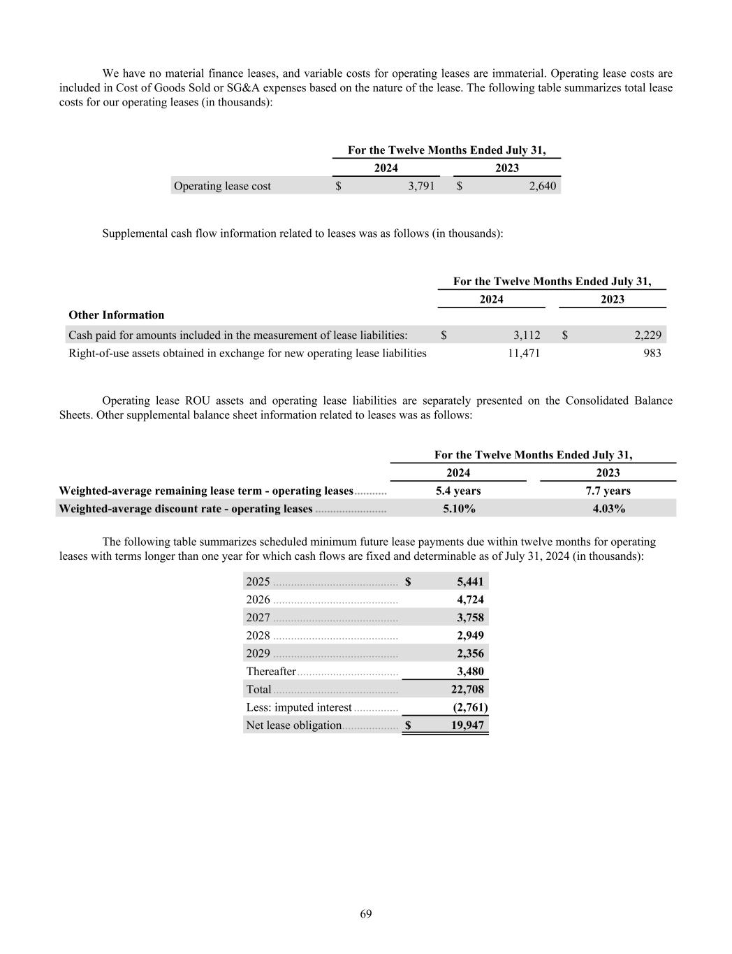 We have no material finance leases, and variable costs for operating leases are immaterial. Operating lease costs are included in Cost of Goods Sold or SG&A expenses based on the nature of the lease. The following table summarizes total lease costs for our operating leases (in thousands): For the Twelve Months Ended July 31, 2024 2023 Operating lease cost $ 3,791 $ 2,640 Supplemental cash flow information related to leases was as follows (in thousands): For the Twelve Months Ended July 31, 2024 2023 Other Information Cash paid for amounts included in the measurement of lease liabilities: $ 3,112 $ 2,229 Right-of-use assets obtained in exchange for new operating lease liabilities 11,471 983 Operating lease ROU assets and operating lease liabilities are separately presented on the Consolidated Balance Sheets. Other supplemental balance sheet information related to leases was as follows: For the Twelve Months Ended July 31, 2024 2023 Weighted-average remaining lease term - operating leases ........... 5.4 years 7.7 years Weighted-average discount rate - operating leases ........................ 5.10% 4.03% The following table summarizes scheduled minimum future lease payments due within twelve months for operating leases with terms longer than one year for which cash flows are fixed and determinable as of July 31, 2024 (in thousands): 2025 .......................................... $ 5,441 2026 .......................................... 4,724 2027 .......................................... 3,758 2028 .......................................... 2,949 2029 .......................................... 2,356 Thereafter .................................. 3,480 Total .......................................... 22,708 Less: imputed interest ............... (2,761) Net lease obligation ................... $ 19,947 69