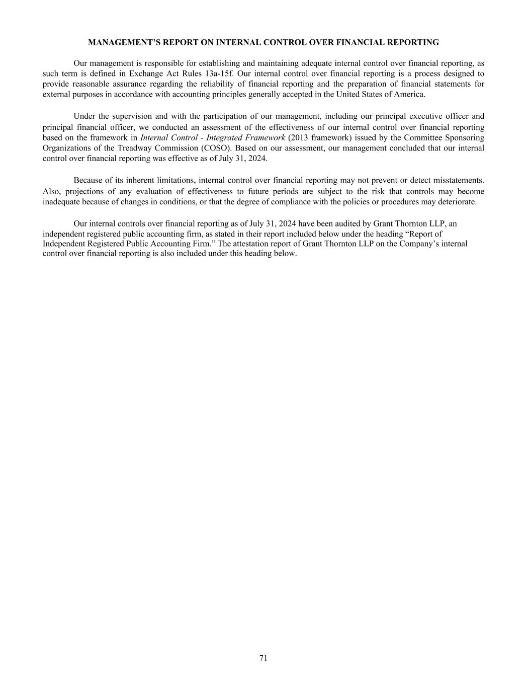 MANAGEMENT’S REPORT ON INTERNAL CONTROL OVER FINANCIAL REPORTING Our management is responsible for establishing and maintaining adequate internal control over financial reporting, as such term is defined in Exchange Act Rules 13a-15f. Our internal control over financial reporting is a process designed to provide reasonable assurance regarding the reliability of financial reporting and the preparation of financial statements for external purposes in accordance with accounting principles generally accepted in the United States of America. Under the supervision and with the participation of our management, including our principal executive officer and principal financial officer, we conducted an assessment of the effectiveness of our internal control over financial reporting based on the framework in Internal Control - Integrated Framework (2013 framework) issued by the Committee Sponsoring Organizations of the Treadway Commission (COSO). Based on our assessment, our management concluded that our internal control over financial reporting was effective as of July 31, 2024. Because of its inherent limitations, internal control over financial reporting may not prevent or detect misstatements. Also, projections of any evaluation of effectiveness to future periods are subject to the risk that controls may become inadequate because of changes in conditions, or that the degree of compliance with the policies or procedures may deteriorate. Our internal controls over financial reporting as of July 31, 2024 have been audited by Grant Thornton LLP, an independent registered public accounting firm, as stated in their report included below under the heading “Report of Independent Registered Public Accounting Firm.” The attestation report of Grant Thornton LLP on the Company’s internal control over financial reporting is also included under this heading below. 71