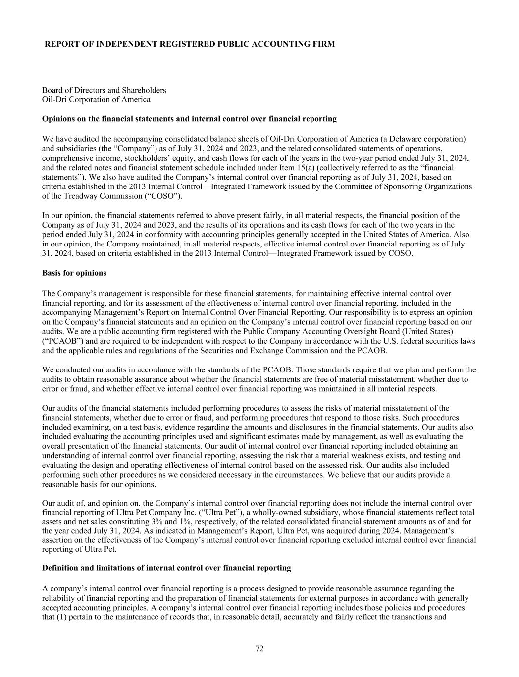 of Directors and Shareholders REPORT OF INDEPENDENT REGISTERED PUBLIC ACCOUNTING FIRM Board of Directors and Shareholders Oil-Dri Corporation of America Opinions on the financial statements and internal control over financial reporting We have audited the accompanying consolidated balance sheets of Oil-Dri Corporation of America (a Delaware corporation) and subsidiaries (the “Company”) as of July 31, 2024 and 2023, and the related consolidated statements of operations, comprehensive income, stockholders’ equity, and cash flows for each of the years in the two-year period ended July 31, 2024, and the related notes and financial statement schedule included under Item 15(a) (collectively referred to as the “financial statements”). We also have audited the Company’s internal control over financial reporting as of July 31, 2024, based on criteria established in the 2013 Internal Control—Integrated Framework issued by the Committee of Sponsoring Organizations of the Treadway Commission (“COSO”). In our opinion, the financial statements referred to above present fairly, in all material respects, the financial position of the Company as of July 31, 2024 and 2023, and the results of its operations and its cash flows for each of the two years in the period ended July 31, 2024 in conformity with accounting principles generally accepted in the United States of America. Also in our opinion, the Company maintained, in all material respects, effective internal control over financial reporting as of July 31, 2024, based on criteria established in the 2013 Internal Control—Integrated Framework issued by COSO. Basis for opinions The Company’s management is responsible for these financial statements, for maintaining effective internal control over financial reporting, and for its assessment of the effectiveness of internal control over financial reporting, included in the accompanying Management’s Report on Internal Control Over Financial Reporting. Our responsibility is to express an opinion on the Company’s financial statements and an opinion on the Company’s internal control over financial reporting based on our audits. We are a public accounting firm registered with the Public Company Accounting Oversight Board (United States) (“PCAOB”) and are required to be independent with respect to the Company in accordance with the U.S. federal securities laws and the applicable rules and regulations of the Securities and Exchange Commission and the PCAOB. We conducted our audits in accordance with the standards of the PCAOB. Those standards require that we plan and perform the audits to obtain reasonable assurance about whether the financial statements are free of material misstatement, whether due to error or fraud, and whether effective internal control over financial reporting was maintained in all material respects. Our audits of the financial statements included performing procedures to assess the risks of material misstatement of the financial statements, whether due to error or fraud, and performing procedures that respond to those risks. Such procedures included examining, on a test basis, evidence regarding the amounts and disclosures in the financial statements. Our audits also included evaluating the accounting principles used and significant estimates made by management, as well as evaluating the overall presentation of the financial statements. Our audit of internal control over financial reporting included obtaining an understanding of internal control over financial reporting, assessing the risk that a material weakness exists, and testing and evaluating the design and operating effectiveness of internal control based on the assessed risk. Our audits also included performing such other procedures as we considered necessary in the circumstances. We believe that our audits provide a reasonable basis for our opinions. Our audit of, and opinion on, the Company’s internal control over financial reporting does not include the internal control over financial reporting of Ultra Pet Company Inc. (“Ultra Pet”), a wholly-owned subsidiary, whose financial statements reflect total assets and net sales constituting 3% and 1%, respectively, of the related consolidated financial statement amounts as of and for the year ended July 31, 2024. As indicated in Management’s Report, Ultra Pet, was acquired during 2024. Management’s assertion on the effectiveness of the Company’s internal control over financial reporting excluded internal control over financial reporting of Ultra Pet. Definition and limitations of internal control over financial reporting A company’s internal control over financial reporting is a process designed to provide reasonable assurance regarding the reliability of financial reporting and the preparation of financial statements for external purposes in accordance with generally accepted accounting principles. A company’s internal control over financial reporting includes those policies and procedures that (1) pertain to the maintenance of records that, in reasonable detail, accurately and fairly reflect the transactions and 72