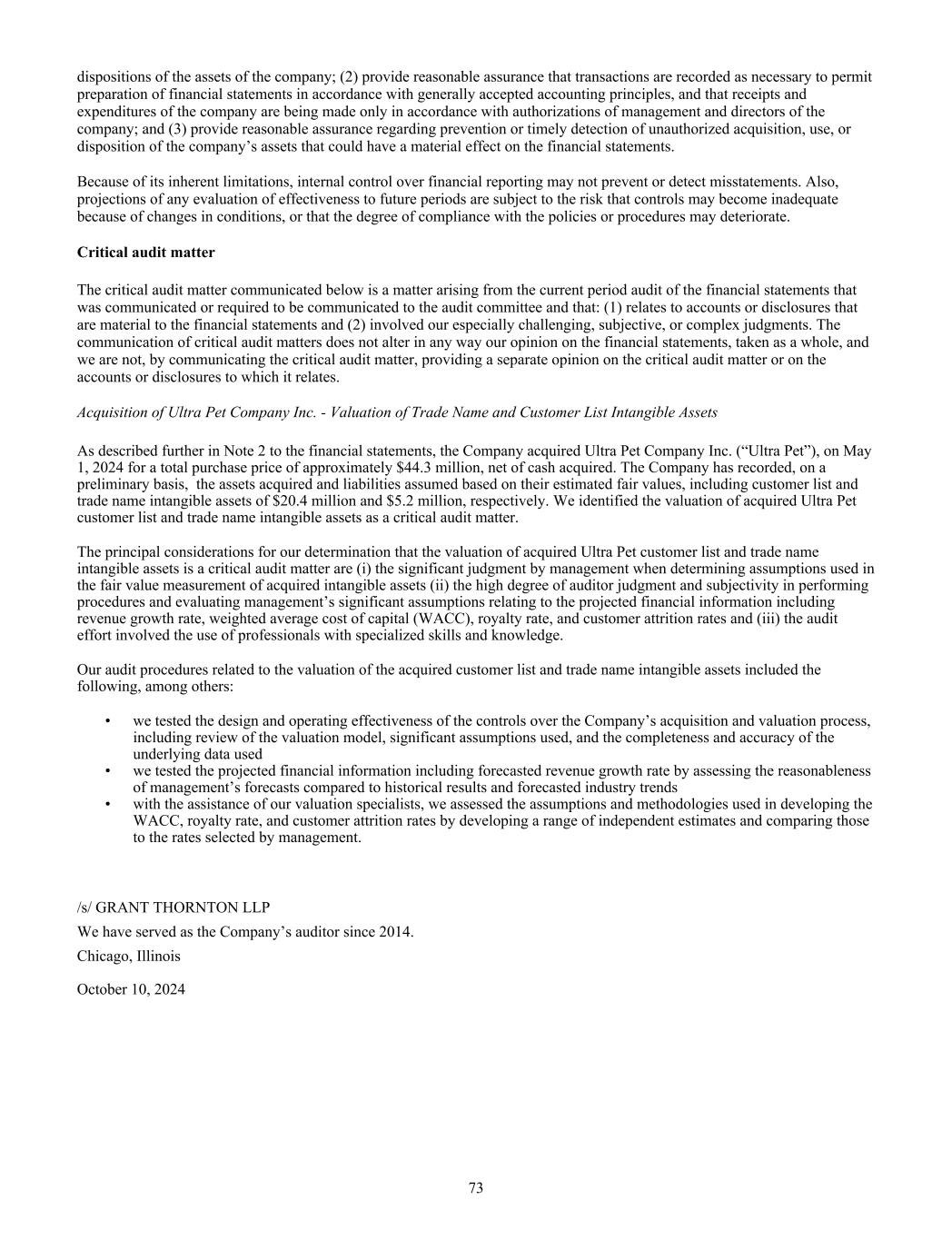 dispositions of the assets of the company; (2) provide reasonable assurance that transactions are recorded as necessary to permit preparation of financial statements in accordance with generally accepted accounting principles, and that receipts and expenditures of the company are being made only in accordance with authorizations of management and directors of the company; and (3) provide reasonable assurance regarding prevention or timely detection of unauthorized acquisition, use, or disposition of the company’s assets that could have a material effect on the financial statements. Because of its inherent limitations, internal control over financial reporting may not prevent or detect misstatements. Also, projections of any evaluation of effectiveness to future periods are subject to the risk that controls may become inadequate because of changes in conditions, or that the degree of compliance with the policies or procedures may deteriorate. Critical audit matter The critical audit matter communicated below is a matter arising from the current period audit of the financial statements that was communicated or required to be communicated to the audit committee and that: (1) relates to accounts or disclosures that are material to the financial statements and (2) involved our especially challenging, subjective, or complex judgments. The communication of critical audit matters does not alter in any way our opinion on the financial statements, taken as a whole, and we are not, by communicating the critical audit matter, providing a separate opinion on the critical audit matter or on the accounts or disclosures to which it relates. Acquisition of Ultra Pet Company Inc. - Valuation of Trade Name and Customer List Intangible Assets As described further in Note 2 to the financial statements, the Company acquired Ultra Pet Company Inc. (“Ultra Pet”), on May 1, 2024 for a total purchase price of approximately $44.3 million, net of cash acquired. The Company has recorded, on a preliminary basis, the assets acquired and liabilities assumed based on their estimated fair values, including customer list and trade name intangible assets of $20.4 million and $5.2 million, respectively. We identified the valuation of acquired Ultra Pet customer list and trade name intangible assets as a critical audit matter. The principal considerations for our determination that the valuation of acquired Ultra Pet customer list and trade name intangible assets is a critical audit matter are (i) the significant judgment by management when determining assumptions used in the fair value measurement of acquired intangible assets (ii) the high degree of auditor judgment and subjectivity in performing procedures and evaluating management’s significant assumptions relating to the projected financial information including revenue growth rate, weighted average cost of capital (WACC), royalty rate, and customer attrition rates and (iii) the audit effort involved the use of professionals with specialized skills and knowledge. Our audit procedures related to the valuation of the acquired customer list and trade name intangible assets included the following, among others: • we tested the design and operating effectiveness of the controls over the Company’s acquisition and valuation process, including review of the valuation model, significant assumptions used, and the completeness and accuracy of the underlying data used • we tested the projected financial information including forecasted revenue growth rate by assessing the reasonableness of management’s forecasts compared to historical results and forecasted industry trends • with the assistance of our valuation specialists, we assessed the assumptions and methodologies used in developing the WACC, royalty rate, and customer attrition rates by developing a range of independent estimates and comparing those to the rates selected by management. /s/ GRANT THORNTON LLP We have served as the Company’s auditor since 2014. Chicago, Illinois October 10, 2024 73