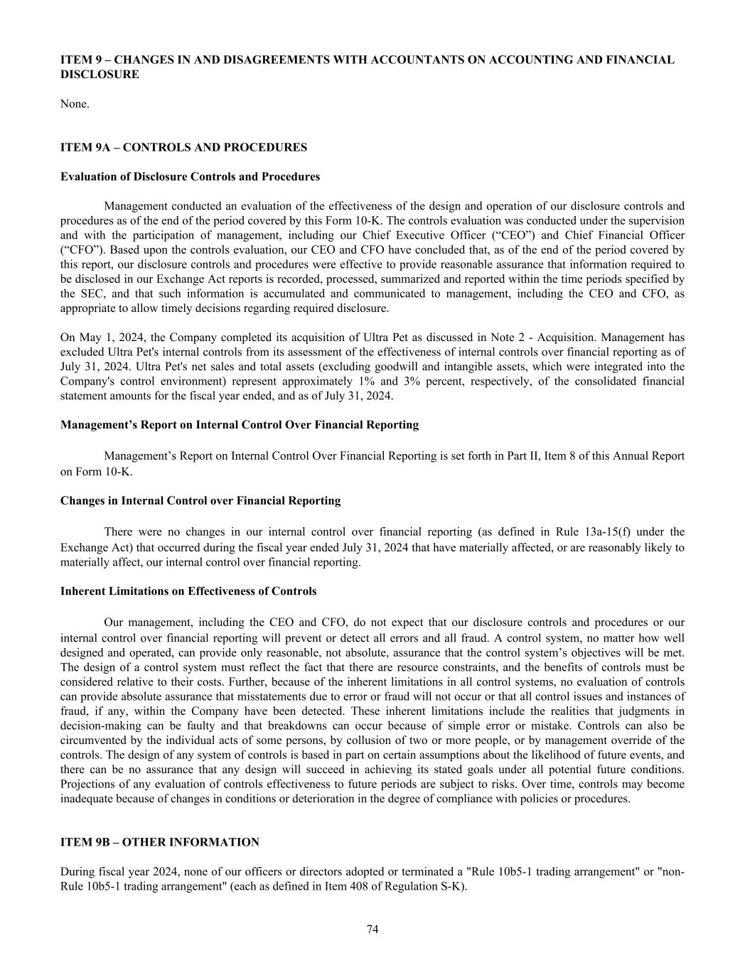 ITEM 9 – CHANGES IN AND DISAGREEMENTS WITH ACCOUNTANTS ON ACCOUNTING AND FINANCIAL DISCLOSURE None. ITEM 9A – CONTROLS AND PROCEDURES Evaluation of Disclosure Controls and Procedures Management conducted an evaluation of the effectiveness of the design and operation of our disclosure controls and procedures as of the end of the period covered by this Form 10-K. The controls evaluation was conducted under the supervision and with the participation of management, including our Chief Executive Officer (“CEO”) and Chief Financial Officer (“CFO”). Based upon the controls evaluation, our CEO and CFO have concluded that, as of the end of the period covered by this report, our disclosure controls and procedures were effective to provide reasonable assurance that information required to be disclosed in our Exchange Act reports is recorded, processed, summarized and reported within the time periods specified by the SEC, and that such information is accumulated and communicated to management, including the CEO and CFO, as appropriate to allow timely decisions regarding required disclosure. On May 1, 2024, the Company completed its acquisition of Ultra Pet as discussed in Note 2 - Acquisition. Management has excluded Ultra Pet's internal controls from its assessment of the effectiveness of internal controls over financial reporting as of July 31, 2024. Ultra Pet's net sales and total assets (excluding goodwill and intangible assets, which were integrated into the Company's control environment) represent approximately 1% and 3% percent, respectively, of the consolidated financial statement amounts for the fiscal year ended, and as of July 31, 2024. Management’s Report on Internal Control Over Financial Reporting Management’s Report on Internal Control Over Financial Reporting is set forth in Part II, Item 8 of this Annual Report on Form 10-K. Changes in Internal Control over Financial Reporting There were no changes in our internal control over financial reporting (as defined in Rule 13a-15(f) under the Exchange Act) that occurred during the fiscal year ended July 31, 2024 that have materially affected, or are reasonably likely to materially affect, our internal control over financial reporting. Inherent Limitations on Effectiveness of Controls Our management, including the CEO and CFO, do not expect that our disclosure controls and procedures or our internal control over financial reporting will prevent or detect all errors and all fraud. A control system, no matter how well designed and operated, can provide only reasonable, not absolute, assurance that the control system’s objectives will be met. The design of a control system must reflect the fact that there are resource constraints, and the benefits of controls must be considered relative to their costs. Further, because of the inherent limitations in all control systems, no evaluation of controls can provide absolute assurance that misstatements due to error or fraud will not occur or that all control issues and instances of fraud, if any, within the Company have been detected. These inherent limitations include the realities that judgments in decision-making can be faulty and that breakdowns can occur because of simple error or mistake. Controls can also be circumvented by the individual acts of some persons, by collusion of two or more people, or by management override of the controls. The design of any system of controls is based in part on certain assumptions about the likelihood of future events, and there can be no assurance that any design will succeed in achieving its stated goals under all potential future conditions. Projections of any evaluation of controls effectiveness to future periods are subject to risks. Over time, controls may become inadequate because of changes in conditions or deterioration in the degree of compliance with policies or procedures. ITEM 9B – OTHER INFORMATION During fiscal year 2024, none of our officers or directors adopted or terminated a "Rule 10b5-1 trading arrangement" or "non- Rule 10b5-1 trading arrangement" (each as defined in Item 408 of Regulation S-K). 74