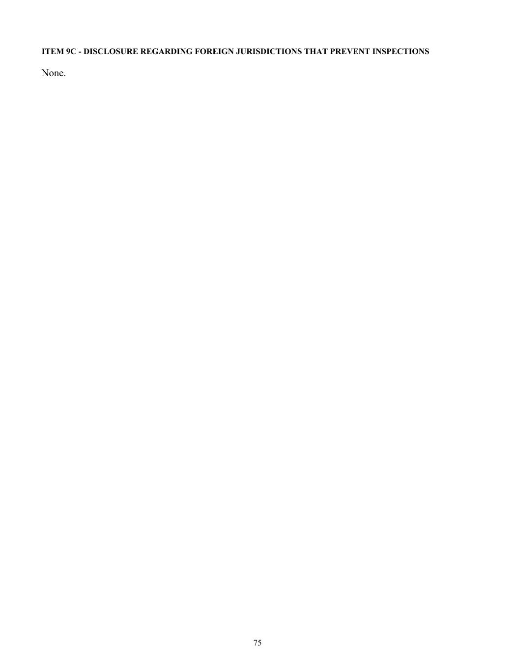 ITEM 9C - DISCLOSURE REGARDING FOREIGN JURISDICTIONS THAT PREVENT INSPECTIONS None. 75