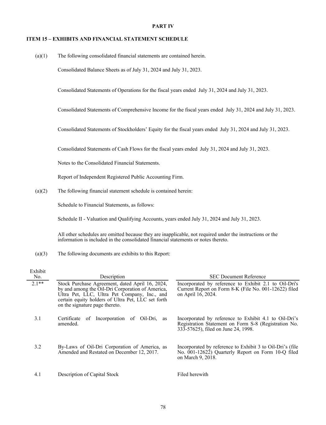 PART IV ITEM 15 – EXHIBITS AND FINANCIAL STATEMENT SCHEDULE (a)(1) The following consolidated financial statements are contained herein. Consolidated Balance Sheets as of July 31, 2024 and July 31, 2023. Consolidated Statements of Operations for the fiscal years ended July 31, 2024 and July 31, 2023. Consolidated Statements of Comprehensive Income for the fiscal years ended July 31, 2024 and July 31, 2023. Consolidated Statements of Stockholders’ Equity for the fiscal years ended July 31, 2024 and July 31, 2023. Consolidated Statements of Cash Flows for the fiscal years ended July 31, 2024 and July 31, 2023. Notes to the Consolidated Financial Statements. Report of Independent Registered Public Accounting Firm. (a)(2) The following financial statement schedule is contained herein: Schedule to Financial Statements, as follows: Schedule II - Valuation and Qualifying Accounts, years ended July 31, 2024 and July 31, 2023. All other schedules are omitted because they are inapplicable, not required under the instructions or the information is included in the consolidated financial statements or notes thereto. (a)(3) The following documents are exhibits to this Report: Exhibit No. Description SEC Document Reference 2.1** Stock Purchase Agreement, dated April 16, 2024, by and among the Oil-Dri Corporation of America, Ultra Pet, LLC, Ultra Pet Company, Inc., and certain equity holders of Ultra Pet, LLC set forth on the signature page thereto. Incorporated by reference to Exhibit 2.1 to Oil-Dri's Current Report on Form 8-K (File No. 001-12622) filed on April 16, 2024. 3.1 Certificate of Incorporation of Oil-Dri, as amended. Incorporated by reference to Exhibit 4.1 to Oil-Dri’s Registration Statement on Form S-8 (Registration No. 333-57625), filed on June 24, 1998. 3.2 By-Laws of Oil-Dri Corporation of America, as Amended and Restated on December 12, 2017. Incorporated by reference to Exhibit 3 to Oil-Dri’s (file No. 001-12622) Quarterly Report on Form 10-Q filed on March 9, 2018. 4.1 Description of Capital Stock Filed herewith 78