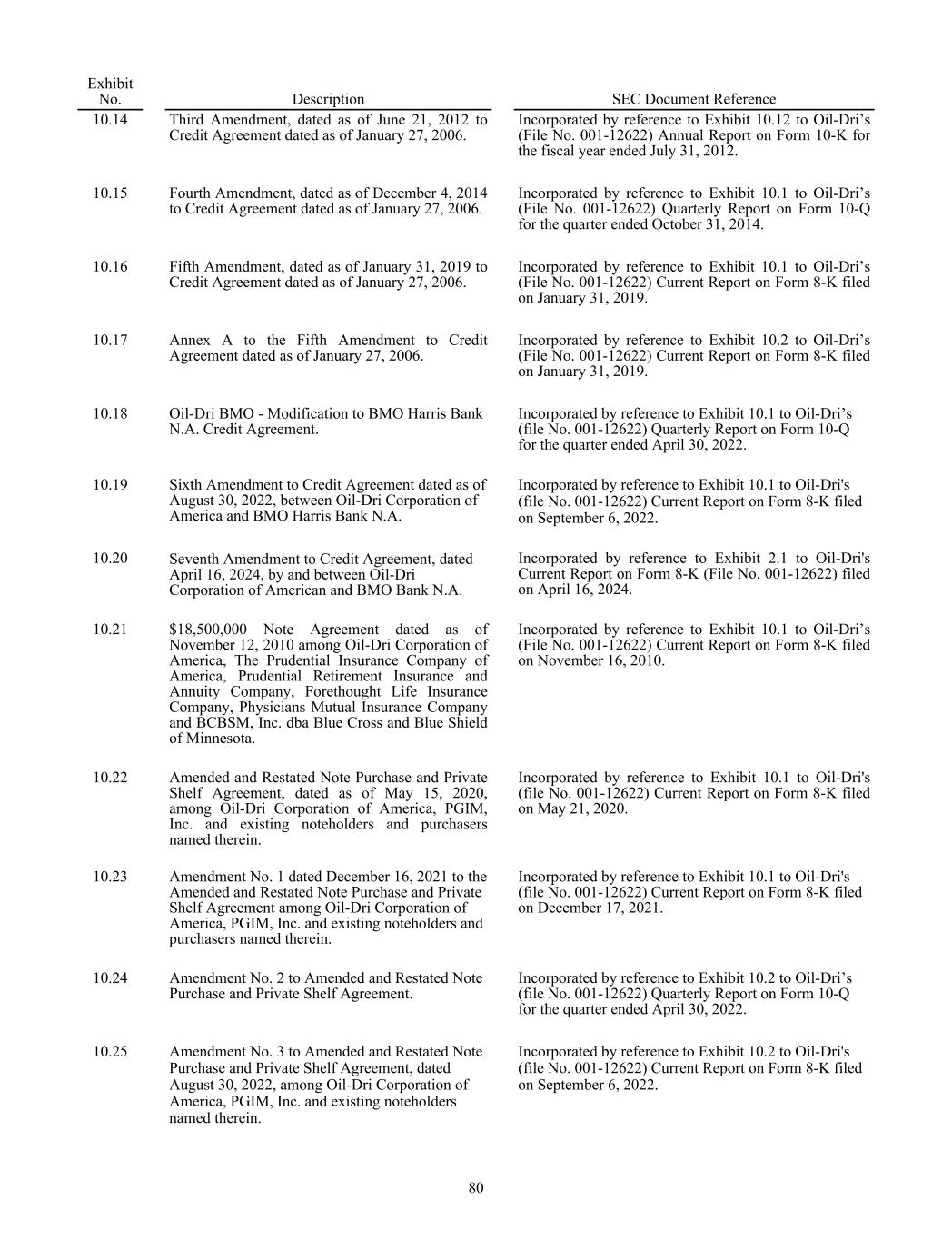 Exhibit No. Description SEC Document Reference 10.14 Third Amendment, dated as of June 21, 2012 to Credit Agreement dated as of January 27, 2006. Incorporated by reference to Exhibit 10.12 to Oil-Dri’s (File No. 001-12622) Annual Report on Form 10-K for the fiscal year ended July 31, 2012. 10.15 Fourth Amendment, dated as of December 4, 2014 to Credit Agreement dated as of January 27, 2006. Incorporated by reference to Exhibit 10.1 to Oil-Dri’s (File No. 001-12622) Quarterly Report on Form 10-Q for the quarter ended October 31, 2014. 10.16 Fifth Amendment, dated as of January 31, 2019 to Credit Agreement dated as of January 27, 2006. Incorporated by reference to Exhibit 10.1 to Oil-Dri’s (File No. 001-12622) Current Report on Form 8-K filed on January 31, 2019. 10.17 Annex A to the Fifth Amendment to Credit Agreement dated as of January 27, 2006. Incorporated by reference to Exhibit 10.2 to Oil-Dri’s (File No. 001-12622) Current Report on Form 8-K filed on January 31, 2019. 10.18 Oil-Dri BMO - Modification to BMO Harris Bank N.A. Credit Agreement. Incorporated by reference to Exhibit 10.1 to Oil-Dri’s (file No. 001-12622) Quarterly Report on Form 10-Q for the quarter ended April 30, 2022. 10.19 Sixth Amendment to Credit Agreement dated as of August 30, 2022, between Oil-Dri Corporation of America and BMO Harris Bank N.A. Incorporated by reference to Exhibit 10.1 to Oil-Dri's (file No. 001-12622) Current Report on Form 8-K filed on September 6, 2022. 10.20 Seventh Amendment to Credit Agreement, dated April 16, 2024, by and between Oil-Dri Corporation of American and BMO Bank N.A. Incorporated by reference to Exhibit 2.1 to Oil-Dri's Current Report on Form 8-K (File No. 001-12622) filed on April 16, 2024. 10.21 $18,500,000 Note Agreement dated as of November 12, 2010 among Oil-Dri Corporation of America, The Prudential Insurance Company of America, Prudential Retirement Insurance and Annuity Company, Forethought Life Insurance Company, Physicians Mutual Insurance Company and BCBSM, Inc. dba Blue Cross and Blue Shield of Minnesota. Incorporated by reference to Exhibit 10.1 to Oil-Dri’s (File No. 001-12622) Current Report on Form 8-K filed on November 16, 2010. 10.22 Amended and Restated Note Purchase and Private Shelf Agreement, dated as of May 15, 2020, among Oil-Dri Corporation of America, PGIM, Inc. and existing noteholders and purchasers named therein. Incorporated by reference to Exhibit 10.1 to Oil-Dri's (file No. 001-12622) Current Report on Form 8-K filed on May 21, 2020. 10.23 Amendment No. 1 dated December 16, 2021 to the Amended and Restated Note Purchase and Private Shelf Agreement among Oil-Dri Corporation of America, PGIM, Inc. and existing noteholders and purchasers named therein. Incorporated by reference to Exhibit 10.1 to Oil-Dri's (file No. 001-12622) Current Report on Form 8-K filed on December 17, 2021. 10.24 Amendment No. 2 to Amended and Restated Note Purchase and Private Shelf Agreement. Incorporated by reference to Exhibit 10.2 to Oil-Dri’s (file No. 001-12622) Quarterly Report on Form 10-Q for the quarter ended April 30, 2022. 10.25 Amendment No. 3 to Amended and Restated Note Purchase and Private Shelf Agreement, dated August 30, 2022, among Oil-Dri Corporation of America, PGIM, Inc. and existing noteholders named therein. Incorporated by reference to Exhibit 10.2 to Oil-Dri's (file No. 001-12622) Current Report on Form 8-K filed on September 6, 2022. 80