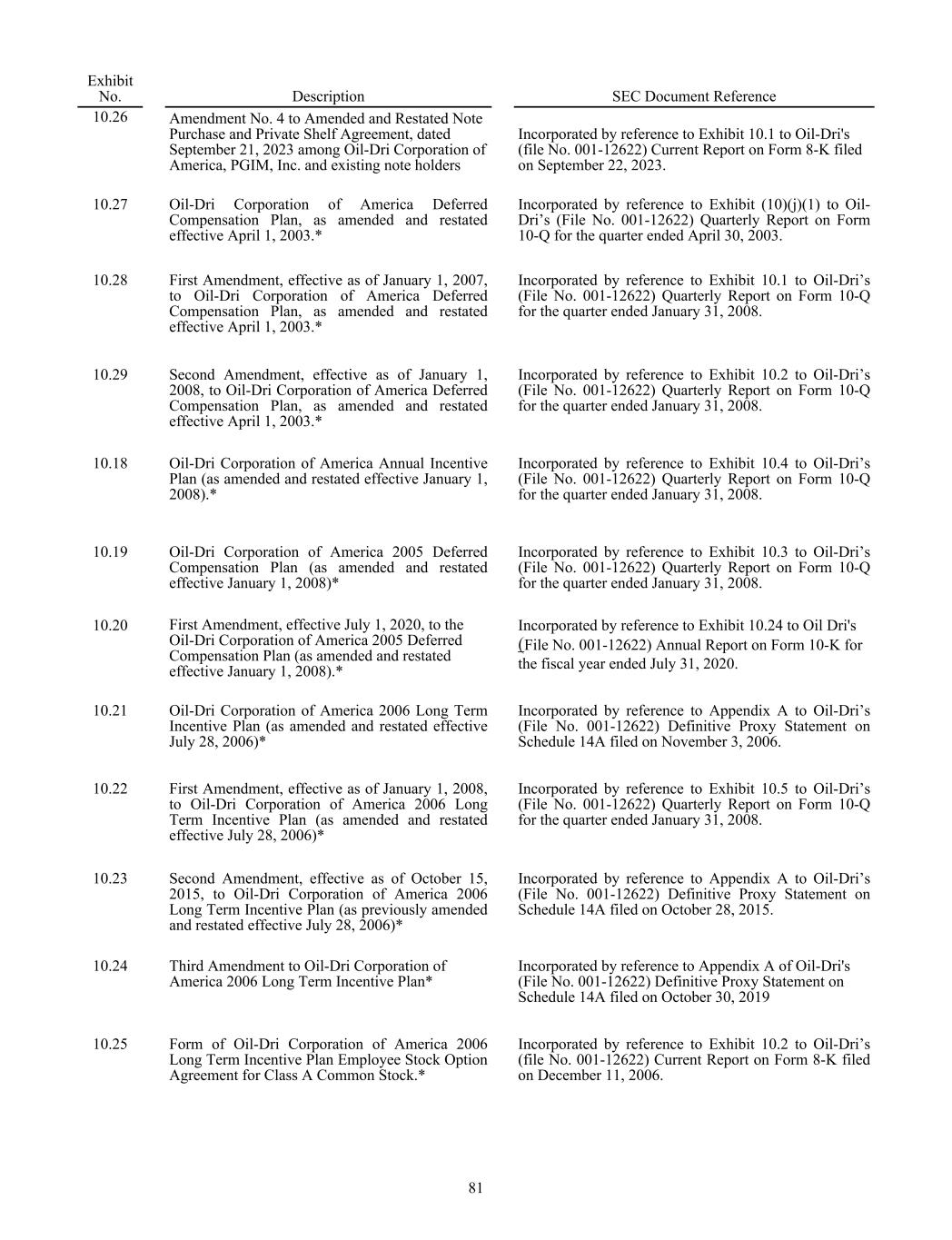 Exhibit No. Description SEC Document Reference 10.26 Amendment No. 4 to Amended and Restated Note Purchase and Private Shelf Agreement, dated September 21, 2023 among Oil-Dri Corporation of America, PGIM, Inc. and existing note holders Incorporated by reference to Exhibit 10.1 to Oil-Dri's (file No. 001-12622) Current Report on Form 8-K filed on September 22, 2023. 10.27 Oil-Dri Corporation of America Deferred Compensation Plan, as amended and restated effective April 1, 2003.* Incorporated by reference to Exhibit (10)(j)(1) to Oil- Dri’s (File No. 001-12622) Quarterly Report on Form 10-Q for the quarter ended April 30, 2003. 10.28 First Amendment, effective as of January 1, 2007, to Oil-Dri Corporation of America Deferred Compensation Plan, as amended and restated effective April 1, 2003.* Incorporated by reference to Exhibit 10.1 to Oil-Dri’s (File No. 001-12622) Quarterly Report on Form 10-Q for the quarter ended January 31, 2008. 10.29 Second Amendment, effective as of January 1, 2008, to Oil-Dri Corporation of America Deferred Compensation Plan, as amended and restated effective April 1, 2003.* Incorporated by reference to Exhibit 10.2 to Oil-Dri’s (File No. 001-12622) Quarterly Report on Form 10-Q for the quarter ended January 31, 2008. 10.18 Oil-Dri Corporation of America Annual Incentive Plan (as amended and restated effective January 1, 2008).* Incorporated by reference to Exhibit 10.4 to Oil-Dri’s (File No. 001-12622) Quarterly Report on Form 10-Q for the quarter ended January 31, 2008. 10.19 Oil-Dri Corporation of America 2005 Deferred Compensation Plan (as amended and restated effective January 1, 2008)* Incorporated by reference to Exhibit 10.3 to Oil-Dri’s (File No. 001-12622) Quarterly Report on Form 10-Q for the quarter ended January 31, 2008. 10.20 First Amendment, effective July 1, 2020, to the Oil-Dri Corporation of America 2005 Deferred Compensation Plan (as amended and restated effective January 1, 2008).* Incorporated by reference to Exhibit 10.24 to Oil Dri's (File No. 001-12622) Annual Report on Form 10-K for the fiscal year ended July 31, 2020. 10.21 Oil-Dri Corporation of America 2006 Long Term Incentive Plan (as amended and restated effective July 28, 2006)* Incorporated by reference to Appendix A to Oil-Dri’s (File No. 001-12622) Definitive Proxy Statement on Schedule 14A filed on November 3, 2006. 10.22 First Amendment, effective as of January 1, 2008, to Oil-Dri Corporation of America 2006 Long Term Incentive Plan (as amended and restated effective July 28, 2006)* Incorporated by reference to Exhibit 10.5 to Oil-Dri’s (File No. 001-12622) Quarterly Report on Form 10-Q for the quarter ended January 31, 2008. 10.23 Second Amendment, effective as of October 15, 2015, to Oil-Dri Corporation of America 2006 Long Term Incentive Plan (as previously amended and restated effective July 28, 2006)* Incorporated by reference to Appendix A to Oil-Dri’s (File No. 001-12622) Definitive Proxy Statement on Schedule 14A filed on October 28, 2015. 10.24 Third Amendment to Oil-Dri Corporation of America 2006 Long Term Incentive Plan* Incorporated by reference to Appendix A of Oil-Dri's (File No. 001-12622) Definitive Proxy Statement on Schedule 14A filed on October 30, 2019 10.25 Form of Oil-Dri Corporation of America 2006 Long Term Incentive Plan Employee Stock Option Agreement for Class A Common Stock.* Incorporated by reference to Exhibit 10.2 to Oil-Dri’s (file No. 001-12622) Current Report on Form 8-K filed on December 11, 2006. 81