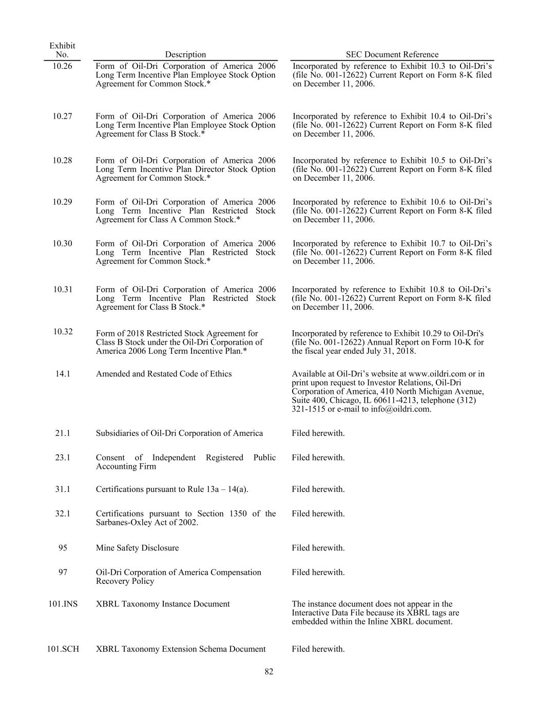 Exhibit No. Description SEC Document Reference 10.26 Form of Oil-Dri Corporation of America 2006 Long Term Incentive Plan Employee Stock Option Agreement for Common Stock.* Incorporated by reference to Exhibit 10.3 to Oil-Dri’s (file No. 001-12622) Current Report on Form 8-K filed on December 11, 2006. 10.27 Form of Oil-Dri Corporation of America 2006 Long Term Incentive Plan Employee Stock Option Agreement for Class B Stock.* Incorporated by reference to Exhibit 10.4 to Oil-Dri’s (file No. 001-12622) Current Report on Form 8-K filed on December 11, 2006. 10.28 Form of Oil-Dri Corporation of America 2006 Long Term Incentive Plan Director Stock Option Agreement for Common Stock.* Incorporated by reference to Exhibit 10.5 to Oil-Dri’s (file No. 001-12622) Current Report on Form 8-K filed on December 11, 2006. 10.29 Form of Oil-Dri Corporation of America 2006 Long Term Incentive Plan Restricted Stock Agreement for Class A Common Stock.* Incorporated by reference to Exhibit 10.6 to Oil-Dri’s (file No. 001-12622) Current Report on Form 8-K filed on December 11, 2006. 10.30 Form of Oil-Dri Corporation of America 2006 Long Term Incentive Plan Restricted Stock Agreement for Common Stock.* Incorporated by reference to Exhibit 10.7 to Oil-Dri’s (file No. 001-12622) Current Report on Form 8-K filed on December 11, 2006. 10.31 Form of Oil-Dri Corporation of America 2006 Long Term Incentive Plan Restricted Stock Agreement for Class B Stock.* Incorporated by reference to Exhibit 10.8 to Oil-Dri’s (file No. 001-12622) Current Report on Form 8-K filed on December 11, 2006. 10.32 Form of 2018 Restricted Stock Agreement for Class B Stock under the Oil-Dri Corporation of America 2006 Long Term Incentive Plan.* Incorporated by reference to Exhibit 10.29 to Oil-Dri's (file No. 001-12622) Annual Report on Form 10-K for the fiscal year ended July 31, 2018. 14.1 Amended and Restated Code of Ethics Available at Oil-Dri’s website at www.oildri.com or in print upon request to Investor Relations, Oil-Dri Corporation of America, 410 North Michigan Avenue, Suite 400, Chicago, IL 60611-4213, telephone (312) 321-1515 or e-mail to info@oildri.com. 21.1 Subsidiaries of Oil-Dri Corporation of America Filed herewith. 23.1 Consent of Independent Registered Public Accounting Firm Filed herewith. 31.1 Certifications pursuant to Rule 13a – 14(a). Filed herewith. 32.1 Certifications pursuant to Section 1350 of the Sarbanes-Oxley Act of 2002. Filed herewith. 95 Mine Safety Disclosure Filed herewith. 97 Oil-Dri Corporation of America Compensation Recovery Policy Filed herewith. 101.INS XBRL Taxonomy Instance Document The instance document does not appear in the Interactive Data File because its XBRL tags are embedded within the Inline XBRL document. 101.SCH XBRL Taxonomy Extension Schema Document Filed herewith. 82
