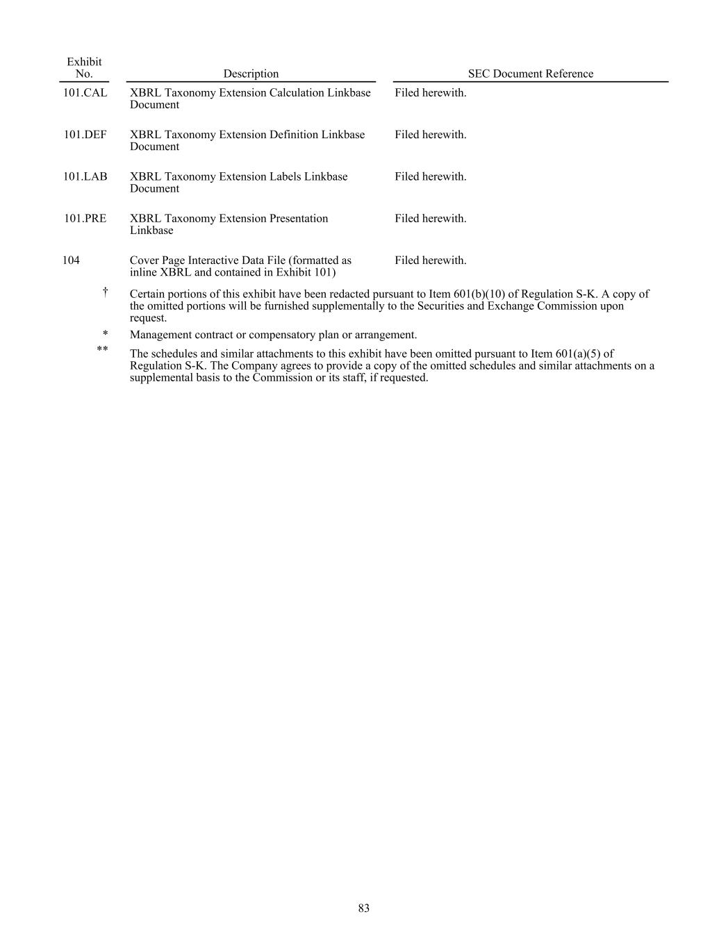101.CAL XBRL Taxonomy Extension Calculation Linkbase Document Filed herewith. 101.DEF XBRL Taxonomy Extension Definition Linkbase Document Filed herewith. 101.LAB XBRL Taxonomy Extension Labels Linkbase Document Filed herewith. 101.PRE XBRL Taxonomy Extension Presentation Linkbase Filed herewith. 104 Cover Page Interactive Data File (formatted as inline XBRL and contained in Exhibit 101) Filed herewith. † Certain portions of this exhibit have been redacted pursuant to Item 601(b)(10) of Regulation S-K. A copy of the omitted portions will be furnished supplementally to the Securities and Exchange Commission upon request. * Management contract or compensatory plan or arrangement. ** The schedules and similar attachments to this exhibit have been omitted pursuant to Item 601(a)(5) of Regulation S-K. The Company agrees to provide a copy of the omitted schedules and similar attachments on a supplemental basis to the Commission or its staff, if requested. 83 Exhibit No. Description SEC Document Reference