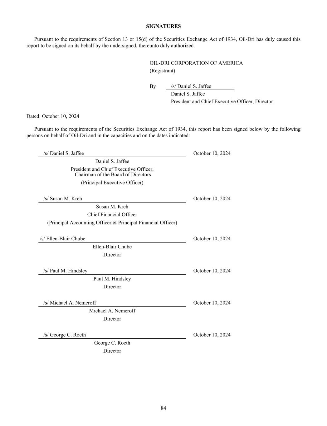 SIGNATURES Pursuant to the requirements of Section 13 or 15(d) of the Securities Exchange Act of 1934, Oil-Dri has duly caused this report to be signed on its behalf by the undersigned, thereunto duly authorized. OIL-DRI CORPORATION OF AMERICA (Registrant) By /s/ Daniel S. Jaffee Daniel S. Jaffee President and Chief Executive Officer, Director Dated: October 10, 2024 Pursuant to the requirements of the Securities Exchange Act of 1934, this report has been signed below by the following persons on behalf of Oil-Dri and in the capacities and on the dates indicated: /s/ Daniel S. Jaffee October 10, 2024 Daniel S. Jaffee President and Chief Executive Officer, Chairman of the Board of Directors (Principal Executive Officer) /s/ Susan M. Kreh October 10, 2024 Susan M. Kreh Chief Financial Officer (Principal Accounting Officer & Principal Financial Officer) /s/ Ellen-Blair Chube October 10, 2024 Ellen-Blair Chube Director /s/ Paul M. Hindsley October 10, 2024 Paul M. Hindsley Director /s/ Michael A. Nemeroff October 10, 2024 Michael A. Nemeroff Director /s/ George C. Roeth October 10, 2024 George C. Roeth Director 84