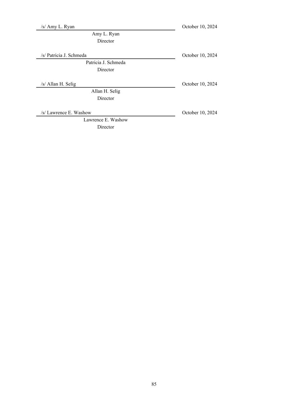 /s/ Amy L. Ryan October 10, 2024 Amy L. Ryan Director /s/ Patricia J. Schmeda October 10, 2024 Patricia J. Schmeda Director /s/ Allan H. Selig October 10, 2024 Allan H. Selig Director /s/ Lawrence E. Washow October 10, 2024 Lawrence E. Washow Director 85