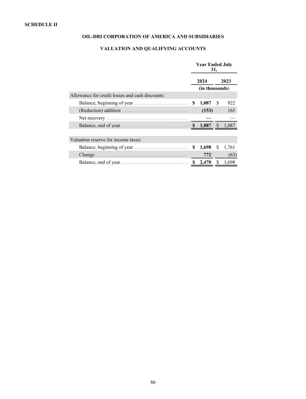 SCHEDULE II OIL-DRI CORPORATION OF AMERICA AND SUBSIDIARIES VALUATION AND QUALIFYING ACCOUNTS Year Ended July 31, 2024 2023 (in thousands) Allowance for credit losses and cash discounts: Balance, beginning of year ........................................... $ 1,087 $ 922 (Reduction) addition .................................................... (153) 165 Net recovery ................................................................. — — Balance, end of year ...................................................... $ 1,087 $ 1,087 Valuation reserve for income taxes: Balance, beginning of year ........................................... $ 1,698 $ 1,761 Change .......................................................................... 772 (63) Balance, end of year ...................................................... $ 2,470 $ 1,698 86