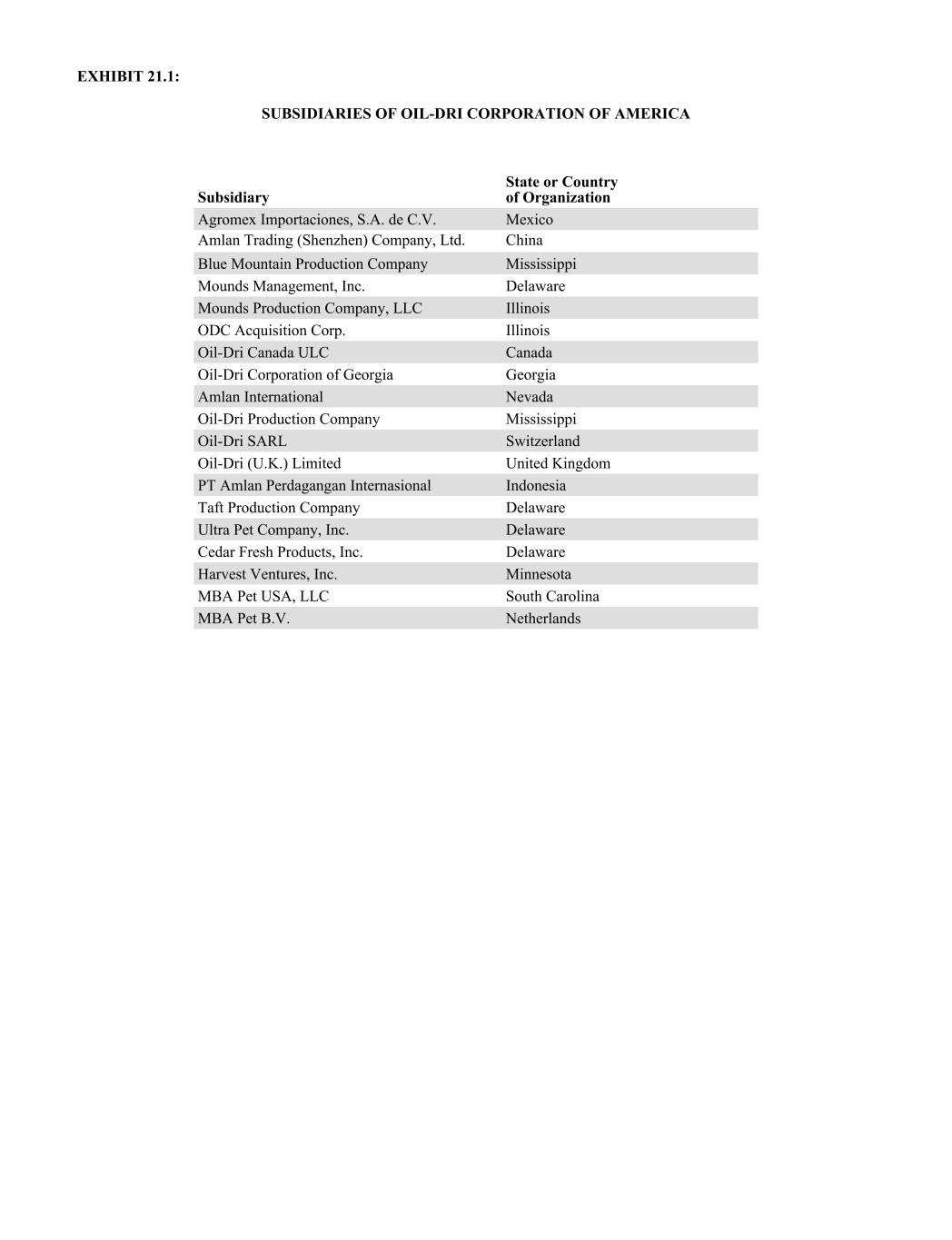 EXHIBIT 21.1: SUBSIDIARIES OF OIL-DRI CORPORATION OF AMERICA Subsidiary State or Country of Organization Agromex Importaciones, S.A. de C.V. Mexico Amlan Trading (Shenzhen) Company, Ltd. China Blue Mountain Production Company Mississippi Mounds Management, Inc. Delaware Mounds Production Company, LLC Illinois ODC Acquisition Corp. Illinois Oil-Dri Canada ULC Canada Oil-Dri Corporation of Georgia Georgia Amlan International Nevada Oil-Dri Production Company Mississippi Oil-Dri SARL Switzerland Oil-Dri (U.K.) Limited United Kingdom PT Amlan Perdagangan Internasional Indonesia Taft Production Company Delaware Ultra Pet Company, Inc. Delaware Cedar Fresh Products, Inc. Delaware Harvest Ventures, Inc. Minnesota MBA Pet USA, LLC South Carolina MBA Pet B.V. Netherlands
