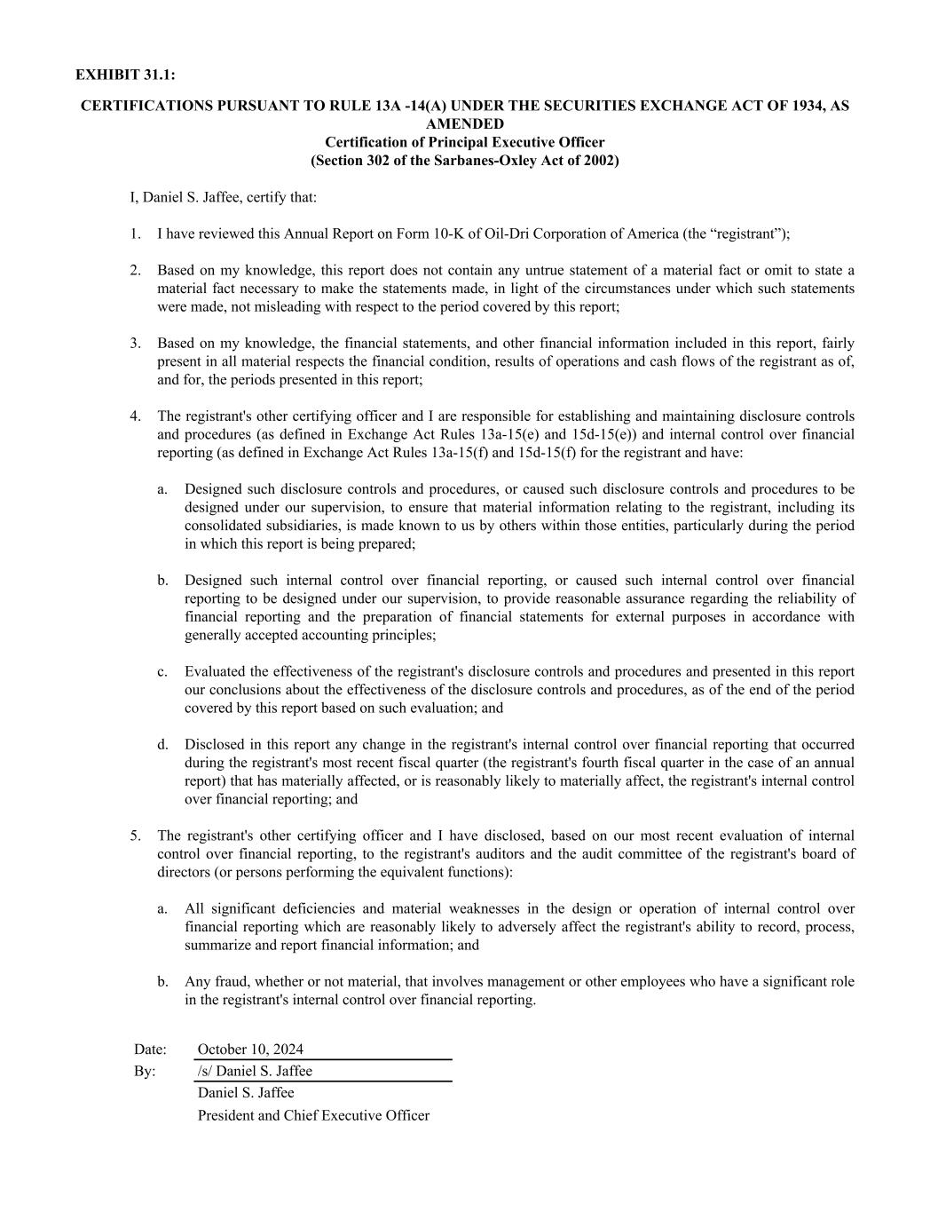 EXHIBIT 31.1: CERTIFICATIONS PURSUANT TO RULE 13A -14(A) UNDER THE SECURITIES EXCHANGE ACT OF 1934, AS AMENDED Certification of Principal Executive Officer (Section 302 of the Sarbanes-Oxley Act of 2002) I, Daniel S. Jaffee, certify that: 1. I have reviewed this Annual Report on Form 10-K of Oil-Dri Corporation of America (the “registrant”); 2. Based on my knowledge, this report does not contain any untrue statement of a material fact or omit to state a material fact necessary to make the statements made, in light of the circumstances under which such statements were made, not misleading with respect to the period covered by this report; 3. Based on my knowledge, the financial statements, and other financial information included in this report, fairly present in all material respects the financial condition, results of operations and cash flows of the registrant as of, and for, the periods presented in this report; 4. The registrant's other certifying officer and I are responsible for establishing and maintaining disclosure controls and procedures (as defined in Exchange Act Rules 13a-15(e) and 15d-15(e)) and internal control over financial reporting (as defined in Exchange Act Rules 13a-15(f) and 15d-15(f) for the registrant and have: a. Designed such disclosure controls and procedures, or caused such disclosure controls and procedures to be designed under our supervision, to ensure that material information relating to the registrant, including its consolidated subsidiaries, is made known to us by others within those entities, particularly during the period in which this report is being prepared; b. Designed such internal control over financial reporting, or caused such internal control over financial reporting to be designed under our supervision, to provide reasonable assurance regarding the reliability of financial reporting and the preparation of financial statements for external purposes in accordance with generally accepted accounting principles; c. Evaluated the effectiveness of the registrant's disclosure controls and procedures and presented in this report our conclusions about the effectiveness of the disclosure controls and procedures, as of the end of the period covered by this report based on such evaluation; and d. Disclosed in this report any change in the registrant's internal control over financial reporting that occurred during the registrant's most recent fiscal quarter (the registrant's fourth fiscal quarter in the case of an annual report) that has materially affected, or is reasonably likely to materially affect, the registrant's internal control over financial reporting; and 5. The registrant's other certifying officer and I have disclosed, based on our most recent evaluation of internal control over financial reporting, to the registrant's auditors and the audit committee of the registrant's board of directors (or persons performing the equivalent functions): a. All significant deficiencies and material weaknesses in the design or operation of internal control over financial reporting which are reasonably likely to adversely affect the registrant's ability to record, process, summarize and report financial information; and b. Any fraud, whether or not material, that involves management or other employees who have a significant role in the registrant's internal control over financial reporting. Date: October 10, 2024 By: /s/ Daniel S. Jaffee Daniel S. Jaffee President and Chief Executive Officer