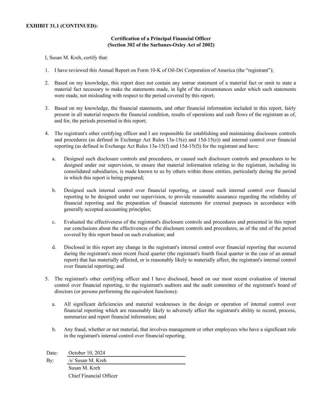 EXHIBIT 31.1 (CONTINUED): Certification of a Principal Financial Officer (Section 302 of the Sarbanes-Oxley Act of 2002) I, Susan M. Kreh, certify that: 1. I have reviewed this Annual Report on Form 10-K of Oil-Dri Corporation of America (the “registrant”); 2. Based on my knowledge, this report does not contain any untrue statement of a material fact or omit to state a material fact necessary to make the statements made, in light of the circumstances under which such statements were made, not misleading with respect to the period covered by this report; 3. Based on my knowledge, the financial statements, and other financial information included in this report, fairly present in all material respects the financial condition, results of operations and cash flows of the registrant as of, and for, the periods presented in this report; 4. The registrant's other certifying officer and I are responsible for establishing and maintaining disclosure controls and procedures (as defined in Exchange Act Rules 13a-15(e) and 15d-15(e)) and internal control over financial reporting (as defined in Exchange Act Rules 13a-15(f) and 15d-15(f)) for the registrant and have: a. Designed such disclosure controls and procedures, or caused such disclosure controls and procedures to be designed under our supervision, to ensure that material information relating to the registrant, including its consolidated subsidiaries, is made known to us by others within those entities, particularly during the period in which this report is being prepared; b. Designed such internal control over financial reporting, or caused such internal control over financial reporting to be designed under our supervision, to provide reasonable assurance regarding the reliability of financial reporting and the preparation of financial statements for external purposes in accordance with generally accepted accounting principles; c. Evaluated the effectiveness of the registrant's disclosure controls and procedures and presented in this report our conclusions about the effectiveness of the disclosure controls and procedures, as of the end of the period covered by this report based on such evaluation; and d. Disclosed in this report any change in the registrant's internal control over financial reporting that occurred during the registrant's most recent fiscal quarter (the registrant's fourth fiscal quarter in the case of an annual report) that has materially affected, or is reasonably likely to materially affect, the registrant's internal control over financial reporting; and 5. The registrant's other certifying officer and I have disclosed, based on our most recent evaluation of internal control over financial reporting, to the registrant's auditors and the audit committee of the registrant's board of directors (or persons performing the equivalent functions): a. All significant deficiencies and material weaknesses in the design or operation of internal control over financial reporting which are reasonably likely to adversely affect the registrant's ability to record, process, summarize and report financial information; and b. Any fraud, whether or not material, that involves management or other employees who have a significant role in the registrant's internal control over financial reporting. Date: October 10, 2024 By: /s/ Susan M. Kreh Susan M. Kreh Chief Financial Officer