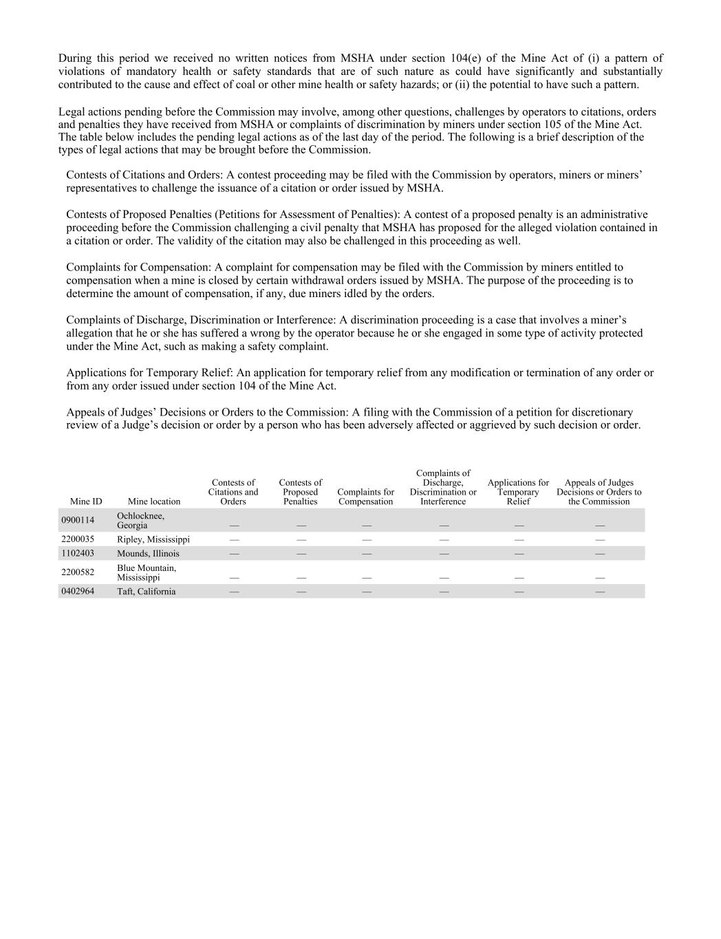 During this period we received no written notices from MSHA under section 104(e) of the Mine Act of (i) a pattern of violations of mandatory health or safety standards that are of such nature as could have significantly and substantially contributed to the cause and effect of coal or other mine health or safety hazards; or (ii) the potential to have such a pattern. Legal actions pending before the Commission may involve, among other questions, challenges by operators to citations, orders and penalties they have received from MSHA or complaints of discrimination by miners under section 105 of the Mine Act. The table below includes the pending legal actions as of the last day of the period. The following is a brief description of the types of legal actions that may be brought before the Commission. Contests of Citations and Orders: A contest proceeding may be filed with the Commission by operators, miners or miners’ representatives to challenge the issuance of a citation or order issued by MSHA. Contests of Proposed Penalties (Petitions for Assessment of Penalties): A contest of a proposed penalty is an administrative proceeding before the Commission challenging a civil penalty that MSHA has proposed for the alleged violation contained in a citation or order. The validity of the citation may also be challenged in this proceeding as well. Complaints for Compensation: A complaint for compensation may be filed with the Commission by miners entitled to compensation when a mine is closed by certain withdrawal orders issued by MSHA. The purpose of the proceeding is to determine the amount of compensation, if any, due miners idled by the orders. Complaints of Discharge, Discrimination or Interference: A discrimination proceeding is a case that involves a miner’s allegation that he or she has suffered a wrong by the operator because he or she engaged in some type of activity protected under the Mine Act, such as making a safety complaint. Applications for Temporary Relief: An application for temporary relief from any modification or termination of any order or from any order issued under section 104 of the Mine Act. Appeals of Judges’ Decisions or Orders to the Commission: A filing with the Commission of a petition for discretionary review of a Judge’s decision or order by a person who has been adversely affected or aggrieved by such decision or order. Mine ID Mine location Contests of Citations and Orders Contests of Proposed Penalties Complaints for Compensation Complaints of Discharge, Discrimination or Interference Applications for Temporary Relief Appeals of Judges Decisions or Orders to the Commission 0900114 Ochlocknee, Georgia — — — — — — 2200035 Ripley, Mississippi — — — — — — 1102403 Mounds, Illinois — — — — — — 2200582 Blue Mountain, Mississippi — — — — — — 0402964 Taft, California — — — — — —