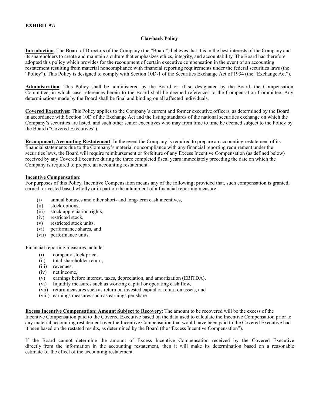 EXHIBIT 97: Clawback Policy Introduction: The Board of Directors of the Company (the “Board”) believes that it is in the best interests of the Company and its shareholders to create and maintain a culture that emphasizes ethics, integrity, and accountability. The Board has therefore adopted this policy which provides for the recoupment of certain executive compensation in the event of an accounting restatement resulting from material noncompliance with financial reporting requirements under the federal securities laws (the “Policy”). This Policy is designed to comply with Section 10D-1 of the Securities Exchange Act of 1934 (the “Exchange Act”). Administration: This Policy shall be administered by the Board or, if so designated by the Board, the Compensation Committee, in which case references herein to the Board shall be deemed references to the Compensation Committee. Any determinations made by the Board shall be final and binding on all affected individuals. Covered Executives: This Policy applies to the Company’s current and former executive officers, as determined by the Board in accordance with Section 10D of the Exchange Act and the listing standards of the national securities exchange on which the Company’s securities are listed, and such other senior executives who may from time to time be deemed subject to the Policy by the Board (“Covered Executives”). Recoupment; Accounting Restatement: In the event the Company is required to prepare an accounting restatement of its financial statements due to the Company’s material noncompliance with any financial reporting requirement under the securities laws, the Board will require reimbursement or forfeiture of any Excess Incentive Compensation (as defined below) received by any Covered Executive during the three completed fiscal years immediately preceding the date on which the Company is required to prepare an accounting restatement. Incentive Compensation: For purposes of this Policy, Incentive Compensation means any of the following; provided that, such compensation is granted, earned, or vested based wholly or in part on the attainment of a financial reporting measure: (i) annual bonuses and other short- and long-term cash incentives, (ii) stock options, (iii) stock appreciation rights, (iv) restricted stock, (v) restricted stock units, (vi) performance shares, and (vii) performance units. Financial reporting measures include: (i) company stock price, (ii) total shareholder return, (iii) revenues, (iv) net income, (v) earnings before interest, taxes, depreciation, and amortization (EBITDA), (vi) liquidity measures such as working capital or operating cash flow, (vii) return measures such as return on invested capital or return on assets, and (viii) earnings measures such as earnings per share. Excess Incentive Compensation: Amount Subject to Recovery: The amount to be recovered will be the excess of the Incentive Compensation paid to the Covered Executive based on the data used to calculate the Incentive Compensation prior to any material accounting restatement over the Incentive Compensation that would have been paid to the Covered Executive had it been based on the restated results, as determined by the Board (the “Excess Incentive Compensation”). If the Board cannot determine the amount of Excess Incentive Compensation received by the Covered Executive directly from the information in the accounting restatement, then it will make its determination based on a reasonable estimate of the effect of the accounting restatement.