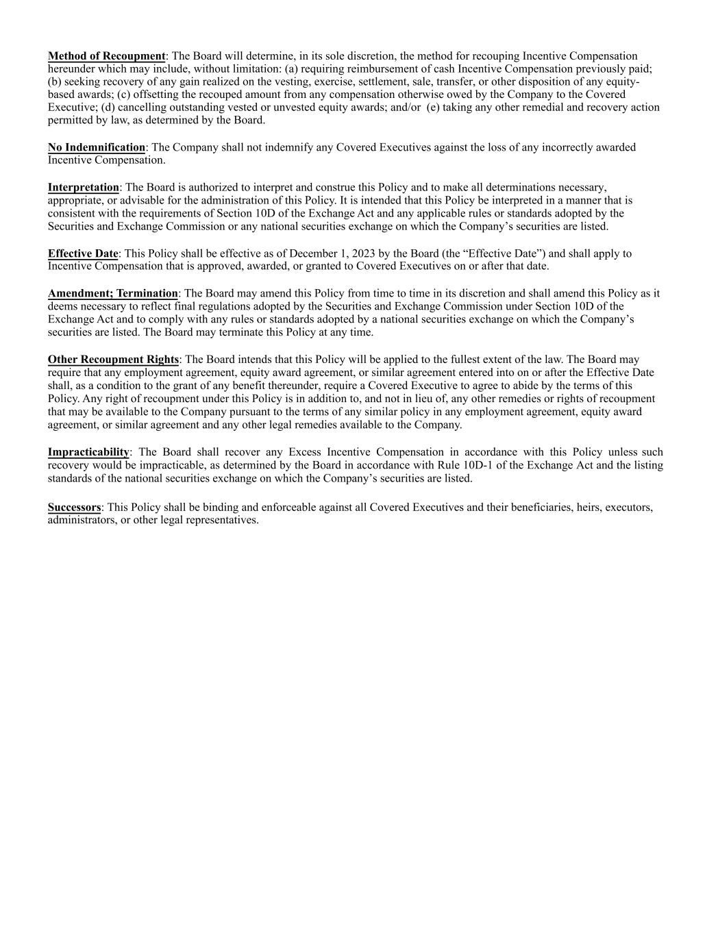 Method of Recoupment: The Board will determine, in its sole discretion, the method for recouping Incentive Compensation hereunder which may include, without limitation: (a) requiring reimbursement of cash Incentive Compensation previously paid; (b) seeking recovery of any gain realized on the vesting, exercise, settlement, sale, transfer, or other disposition of any equity- based awards; (c) offsetting the recouped amount from any compensation otherwise owed by the Company to the Covered Executive; (d) cancelling outstanding vested or unvested equity awards; and/or (e) taking any other remedial and recovery action permitted by law, as determined by the Board. No Indemnification: The Company shall not indemnify any Covered Executives against the loss of any incorrectly awarded Incentive Compensation. Interpretation: The Board is authorized to interpret and construe this Policy and to make all determinations necessary, appropriate, or advisable for the administration of this Policy. It is intended that this Policy be interpreted in a manner that is consistent with the requirements of Section 10D of the Exchange Act and any applicable rules or standards adopted by the Securities and Exchange Commission or any national securities exchange on which the Company’s securities are listed. Effective Date: This Policy shall be effective as of December 1, 2023 by the Board (the “Effective Date”) and shall apply to Incentive Compensation that is approved, awarded, or granted to Covered Executives on or after that date. Amendment; Termination: The Board may amend this Policy from time to time in its discretion and shall amend this Policy as it deems necessary to reflect final regulations adopted by the Securities and Exchange Commission under Section 10D of the Exchange Act and to comply with any rules or standards adopted by a national securities exchange on which the Company’s securities are listed. The Board may terminate this Policy at any time. Other Recoupment Rights: The Board intends that this Policy will be applied to the fullest extent of the law. The Board may require that any employment agreement, equity award agreement, or similar agreement entered into on or after the Effective Date shall, as a condition to the grant of any benefit thereunder, require a Covered Executive to agree to abide by the terms of this Policy. Any right of recoupment under this Policy is in addition to, and not in lieu of, any other remedies or rights of recoupment that may be available to the Company pursuant to the terms of any similar policy in any employment agreement, equity award agreement, or similar agreement and any other legal remedies available to the Company. Impracticability: The Board shall recover any Excess Incentive Compensation in accordance with this Policy unless such recovery would be impracticable, as determined by the Board in accordance with Rule 10D-1 of the Exchange Act and the listing standards of the national securities exchange on which the Company’s securities are listed. Successors: This Policy shall be binding and enforceable against all Covered Executives and their beneficiaries, heirs, executors, administrators, or other legal representatives.