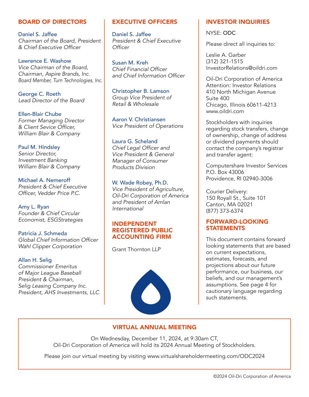 BOARD OF DIRECTORS Daniel S. Jaffee Chairman of the Board, President & Chief Executive Officer Lawrence E. Washow Vice Chairman of the Board, Chairman, Aspire Brands, Inc. Board Member, Turn Technologies, Inc. George C. Roeth Lead Director of the Board Ellen-Blair Chube Former Managing Director & Client Sevice Officer, William Blair & Company Paul M. Hindsley Senior Director, Investment Banking William Blair & Company Michael A. Nemeroff President & Chief Executive Officer, Vedder Price P.C. Amy L. Ryan Founder & Chief Circular Economist, ESGStrategies Patricia J. Schmeda Global Chief Information Officer Wahl Clipper Corporation Allan H. Selig Commissioner Emeritus of Major League Baseball President & Chairman, Selig Leasing Company Inc. President, AHS Investments, LLC EXECUTIVE OFFICERS Daniel S. Jaffee President & Chief Executive Officer Susan M. Kreh Chief Financial Officer and Chief Information Officer Christopher B. Lamson Group Vice President of Retail & Wholesale Aaron V. Christiansen Vice President of Operations Laura G. Scheland Chief Legal Officer and Vice President & General Manager of Consumer Products Division W. Wade Robey, Ph.D. Vice President of Agriculture, Oil-Dri Corporation of America and President of Amlan International INDEPENDENT REGISTERED PUBLIC ACCOUNTING FIRM Grant Thornton LLP INVESTOR INQUIRIES NYSE: ODC Please direct all inquiries to: Leslie A. Garber (312) 321-1515 InvestorRelations@oildri.com Oil-Dri Corporation of America Attention: Investor Relations 410 North Michigan Avenue Suite 400 Chicago, Illinois 60611-4213 www.oildri.com Stockholders with inquiries regarding stock transfers, change of ownership, change of address or dividend payments should contact the company’s registrar and transfer agent: Computershare Investor Services P.O. Box 43006 Providence, RI 02940-3006 Courier Delivery: 150 Royall St., Suite 101 Canton, MA 02021 (877) 373-6374 FORWARD-LOOKING STATEMENTS This document contains forward looking statements that are based on current expectations, estimates, forecasts, and projections about our future performance, our business, our beliefs, and our management’s assumptions. See page 4 for cautionary language regarding such statements. ©2024 Oil-Dri Corporation of America VIRTUAL ANNUAL MEETING On Wednesday, December 11, 2024, at 9:30am CT, Oil-Dri Corporation of America will hold its 2024 Annual Meeting of Stockholders. Please join our virtual meeting by visiting www.virtualshareholdermeeting.com/ODC2024