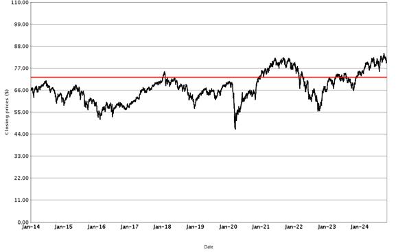 The following graphs set forth historical closing values of the Underliers for the period from January 1, 2014 to October 28, 2024. Each red line represents the Buffer Value of the relevant Underlier. We obtained the information in the graphs from Bloomberg Financial Markets, without independent investigation. We cannot give you assurance that the performance of the Underliers will result in the return of all of your initial investment.