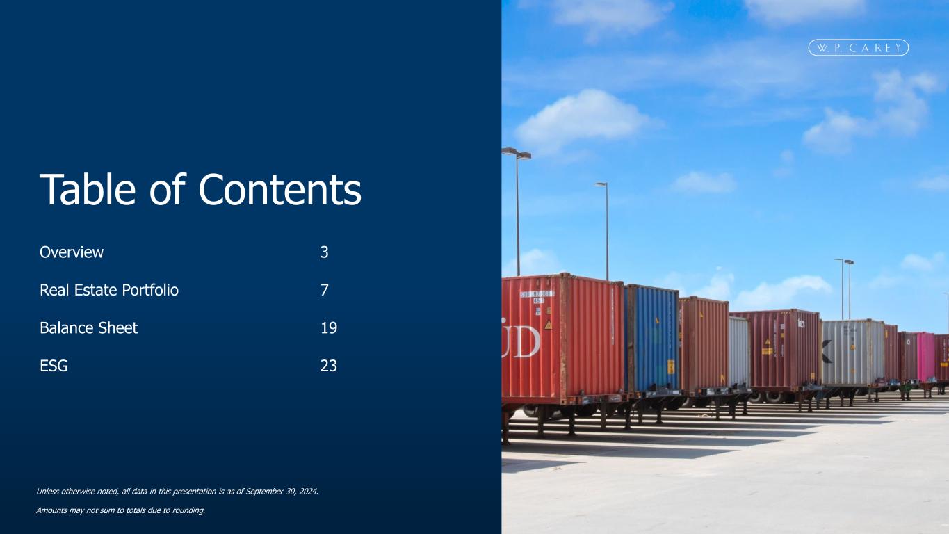 Table of Contents Unless otherwise noted, all data in this presentation is as of September 30, 2024. Amounts may not sum to totals due to rounding. Overview Real Estate Portfolio Balance Sheet ESG 3 7 19 23
