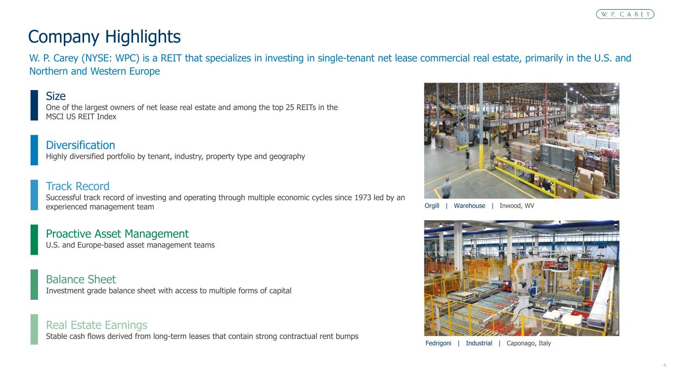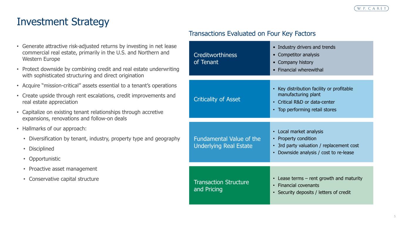 4 Size One of the largest owners of net lease real estate and among the top 25 REITs in the MSCI US REIT Index Diversification Highly diversified portfolio by tenant, industry, property type and geography Track Record Successful track record of investing and operating through multiple economic cycles since 1973 led by an experienced management team Proactive Asset Management U.S. and Europe-based asset management teams Balance Sheet Investment grade balance sheet with access to multiple forms of capital Real Estate Earnings Stable cash flows derived from long-term leases that contain strong contractual rent bumps W. P. Carey (NYSE: WPC) is a REIT that specializes in investing in single-tenant net lease commercial real estate, primarily in the U.S. and Northern and Western Europe Company Highlights Orgill | Warehouse | Inwood, WV Fedrigoni | Industrial | Caponago, Italy