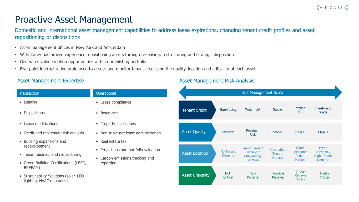 5 • Generate attractive risk-adjusted returns by investing in net lease commercial real estate, primarily in the U.S. and Northern and Western Europe • Protect downside by combining credit and real estate underwriting with sophisticated structuring and direct origination • Acquire “mission-critical” assets essential to a tenant’s operations • Create upside through rent escalations, credit improvements and real estate appreciation • Capitalize on existing tenant relationships through accretive expansions, renovations and follow-on deals • Hallmarks of our approach: • Diversification by tenant, industry, property type and geography • Disciplined • Opportunistic • Proactive asset management • Conservative capital structure Investment Strategy Transactions Evaluated on Four Key Factors Creditworthiness of Tenant • Industry drivers and trends • Competitor analysis • Company history • Financial wherewithal Criticality of Asset • Key distribution facility or profitable manufacturing plant • Critical R&D or data-center • Top performing retail stores Fundamental Value of the Underlying Real Estate • Local market analysis • Property condition • 3rd party valuation / replacement cost • Downside analysis / cost to re-lease Transaction Structure and Pricing • Lease terms – rent growth and maturity • Financial covenants • Security deposits / letters of credit