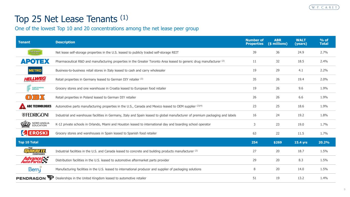 8 1. Portfolio information reflects pro rata ownership of real estate assets (excluding operating properties) as of September 30, 2024. 2. Other includes leases attributable to percentage rent (i.e., participation in the gross revenues of the tenant above a stated level), as well as leases with no escalations. Includes $35.6 million (2.7%) of ABR from a tenant (Extra Space Storage, Inc.), which has both a percentage rent component and annual fixed rent increases in its lease. 3. Metrics shown for operating self-storage portfolio only; excludes net-lease self-storage assets which are captured in net-lease portfolio metrics. Large Diversified Portfolio (1) Ne t-L ea se P or tfo lio Number of Properties 1,430 Number of Tenants 346 Square Footage 171.8 million ABR $1.33 billion North America / Europe / Other (% of ABR) 64% / 36% / 1% Contractual Rent Escalation: CPI-linked / Fixed / Other (2) 53% / 43% / 4% WALT 12.2 years Occupancy 98.8% Investment Grade Tenants (% of ABR) 24.6% Top 10 Tenant Concentration (% of ABR) 20.2% Se lf- St or ag e (3 ) Number of Properties 78 Number of Units 48,242 Average Occupancy 89.9%