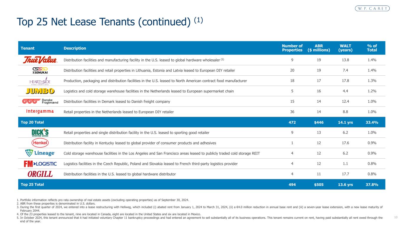 9 One of the lowest Top 10 and 20 concentrations among the net lease peer group Top 25 Net Lease Tenants (1) Tenant Description Number of Properties ABR ($ millions) WALT (years) % of Total Net lease self-storage properties in the U.S. leased to publicly traded self-storage REIT 39 36 24.9 2.7% Pharmaceutical R&D and manufacturing properties in the Greater Toronto Area leased to generic drug manufacturer (2) 11 32 18.5 2.4% Business-to-business retail stores in Italy leased to cash and carry wholesaler 19 29 4.1 2.2% Retail properties in Germany leased to German DIY retailer (3) 35 26 19.4 2.0% Grocery stores and one warehouse in Croatia leased to European food retailer 19 26 9.6 1.9% Retail properties in Poland leased to German DIY retailer 26 26 6.6 1.9% Automotive parts manufacturing properties in the U.S., Canada and Mexico leased to OEM supplier (2)(4) 23 25 18.6 1.9% Industrial and warehouse facilities in Germany, Italy and Spain leased to global manufacturer of premium packaging and labels 16 24 19.2 1.8% K-12 private schools in Orlando, Miami and Houston leased to international day and boarding school operator 3 23 19.0 1.7% Grocery stores and warehouses in Spain leased to Spanish food retailer 63 22 11.5 1.7% Top 10 Total 254 $269 15.4 yrs 20.2% Industrial facilities in the U.S. and Canada leased to concrete and building products manufacturer (2) 27 20 18.7 1.5% Distribution facilities in the U.S. leased to automotive aftermarket parts provider 29 20 8.3 1.5% Manufacturing facilities in the U.S. leased to international producer and supplier of packaging solutions 8 20 14.0 1.5% Dealerships in the United Kingdom leased to automotive retailer 51 19 13.2 1.4%