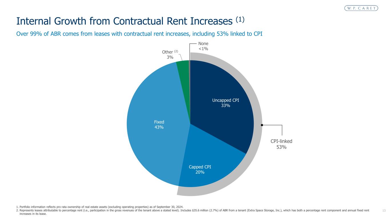 12 North America, 64% $850MM United States, 59% $781MM Canada (2), 4% $55MM Mexico (3), 1% $14MM Europe, 36% $476MM Other (4), 1% $8MM 1. Portfolio information reflects pro rata ownership of real estate assets (excluding operating properties) as of September 30, 2024. 2. $49MM (90%) of ABR from Canada-based properties denominated in USD with the balance in CAD. 3. All ABR from Mexico-based properties denominated in USD. 4. Includes Mauritius (0.4%) and Japan (0.2%). W. P. Carey has been investing internationally for over 25 years, primarily in Northern and Western Europe Geographic Diversification (1) Through our financing and hedging strategies, we’ve significantly mitigated currency risk through a combination of over-weighting our debt in foreign currencies and utilizing contractual cash flow hedges.