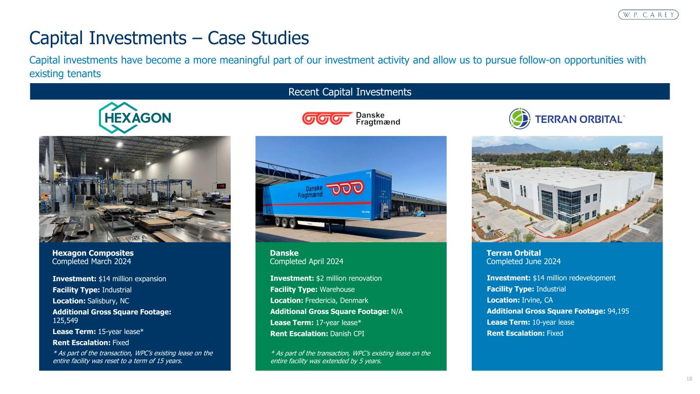 17 Recent investment activity has been focused primarily on mission critical industrial and warehouse properties and essential retail Recent Acquisitions Purchase Price: $86 million Transaction Type: Sale-leaseback Facility Type: Industrial / Warehouse Location: Various, Italy (4) / Laval, Canada (1) Gross Square Footage: 1,081,900 Lease Term: 25-year lease* Rent Escalation: Italian CPI / Fixed (Canada) Metra March 2024 (5 properties) Purchase Price: $191 million Transaction Type: Acquisition Facility Type: Industrial / Warehouse Location: Various, U.S. (16) / Canada (3) Gross Square Footage: 3,115,446 Lease Term: 13-year weighted average Rent Escalation: U.S. CPI / Fixed Angelo Gordon Portfolio May – August 2024 (19 properties) Zabka July / September 2024 (123 properties) Purchase Price: $32 million Transaction Type: Sale-leaseback Facility Type: Retail Location: Various, Poland Gross Square Footage: 146,930 Lease Term: 20-year lease Rent Escalation: Eurozone CPI Recent Acquisitions – Case Studies * As part of the transaction, WPC’s existing Canadian lease with Metra was reset to a term of 25 years. Portfolio Acquisition