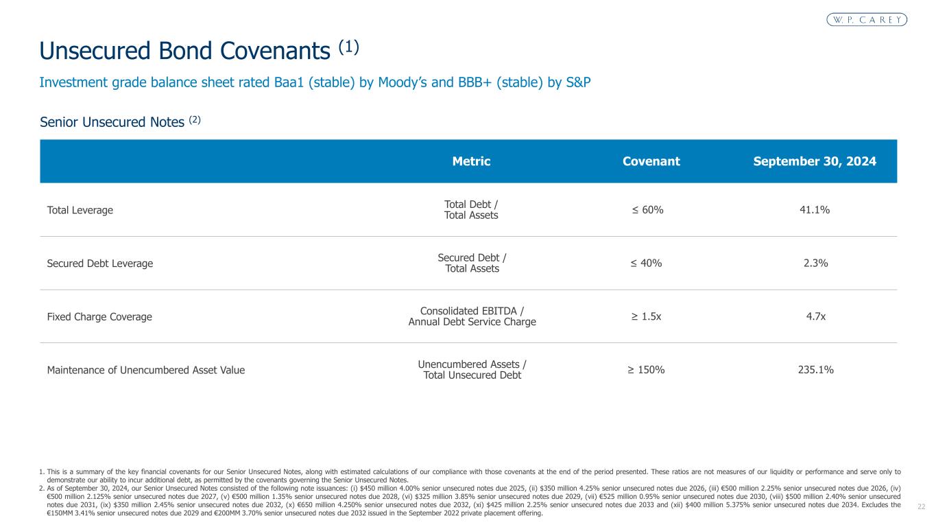 21 % of Total (4) 0.1% 8.6% 20.1% 7.3% 15.3% 9.0% 7.2% 6.2% 16.0% 5.3% 4.9% Interest Rate (4) 4.5% 4.2% 3.7% 2.2% 3.4% 3.8% 1.0% 2.4% 3.7% 2.3% 5.4% $M M 1. Reflects amount due at maturity, excluding unamortized discount and unamortized deferred financing costs. 2. Reflects pro rata balloon payments due at maturity. W. P. Carey has one fully amortizing mortgage due in 2031 ($2MM). 3. Includes amounts drawn under the credit facility as of September 30, 2024. 4. Reflects the weighted average percentage of debt outstanding and the weighted average interest rate for each year based on the total outstanding balance as of September 30, 2024. 4 241 153 29 73 11 2 560 560 560 168 588 952 450 350 325 500 350 425 400 560 603 230 0 200 400 600 800 1,000 1,200 1,400 1,600 1,800 2024 2025 2026 2027 2028 2029 2030 2031 2032 2033 2034 Mortgage Debt Unsecured Bonds (EUR) Unsecured Bonds (USD) Unsecured Term Loans Unsecured Revolving Credit Facility (2) (3) Debt Maturity Schedule Principal at Maturity (1)