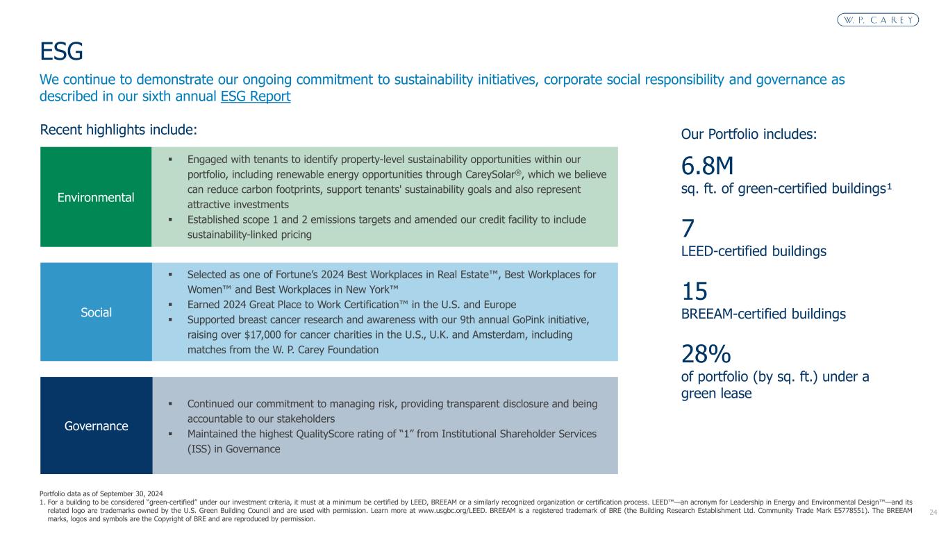 24 We continue to demonstrate our ongoing commitment to sustainability initiatives, corporate social responsibility and governance as described in our sixth annual ESG Report ESG Governance Social Environmental Selected as one of Fortune’s 2024 Best Workplaces in Real Estate , Best Workplaces for Women and Best Workplaces in New York Earned 2024 Great Place to Work Certification in the U.S. and Europe Supported breast cancer research and awareness with our 9th annual GoPink initiative, raising over $17,000 for cancer charities in the U.S., U.K. and Amsterdam, including matches from the W. P. Carey Foundation Continued our commitment to managing risk, providing transparent disclosure and being accountable to our stakeholders Maintained the highest QualityScore rating of “1” from Institutional Shareholder Services (ISS) in Governance Recent highlights include: Engaged with tenants to identify property-level sustainability opportunities within our portfolio, including renewable energy opportunities through CareySolar®, which we believe can reduce carbon footprints, support tenants' sustainability goals and also represent attractive investments Established scope 1 and 2 emissions targets and amended our credit facility to include sustainability-linked pricing Our Portfolio includes: 6.8M sq. ft. of green-certified buildings¹ 7 LEED-certified buildings 15 BREEAM-certified buildings 28% of portfolio (by sq. ft.) under a green lease Portfolio data as of September 30, 2024 1. For a building to be considered “green-certified” under our investment criteria, it must at a minimum be certified by LEED, BREEAM or a similarly recognized organization or certification process. LEED —an acronym for Leadership in Energy and Environmental Design —and its related logo are trademarks owned by the U.S. Green Building Council and are used with permission. Learn more at www.usgbc.org/LEED. BREEAM is a registered trademark of BRE (the Building Research Establishment Ltd. Community Trade Mark E5778551). The BREEAM marks, logos and symbols are the Copyright of BRE and are reproduced by permission.