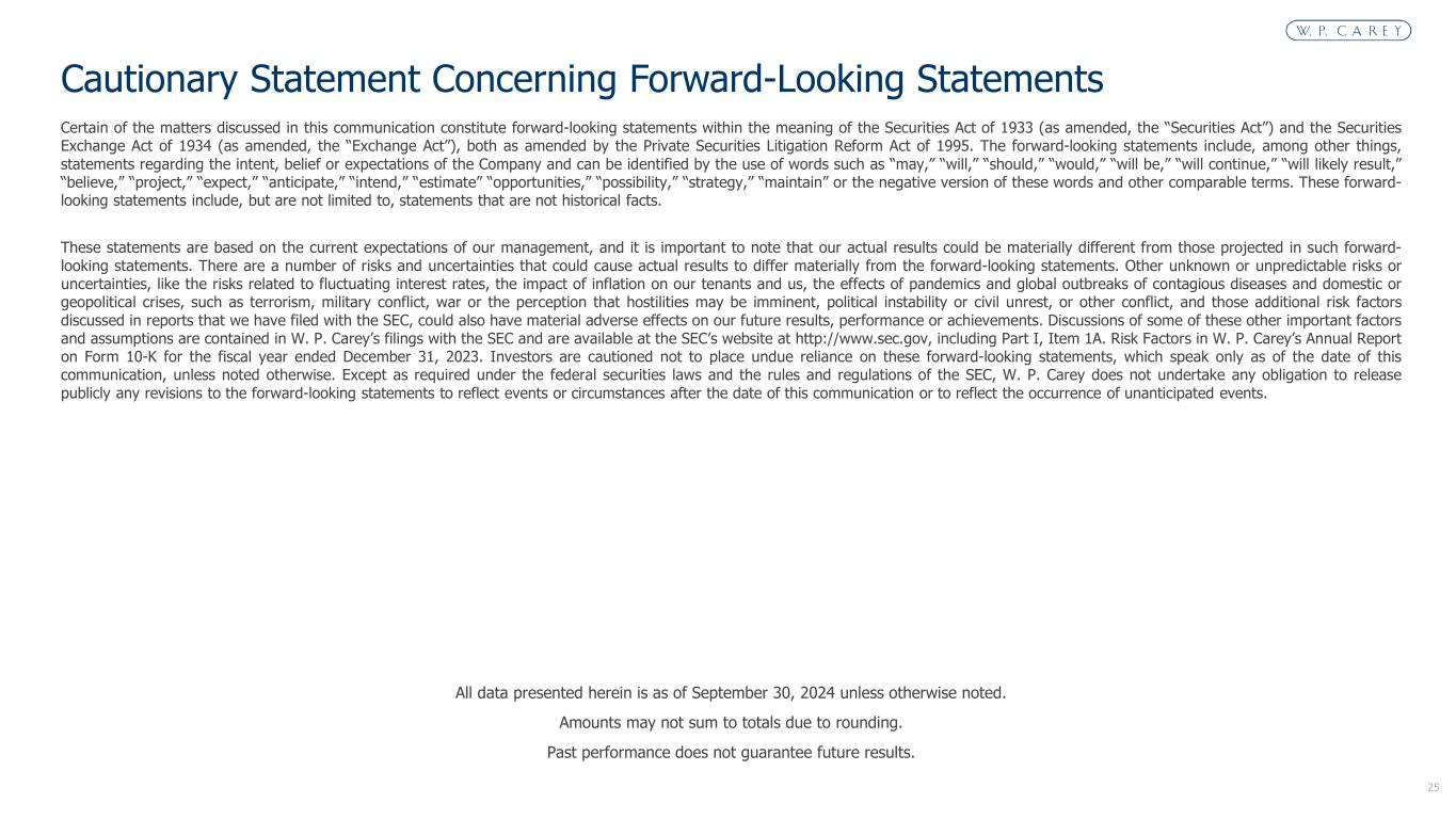 25 Certain of the matters discussed in this communication constitute forward-looking statements within the meaning of the Securities Act of 1933 (as amended, the “Securities Act”) and the Securities Exchange Act of 1934 (as amended, the “Exchange Act”), both as amended by the Private Securities Litigation Reform Act of 1995. The forward-looking statements include, among other things, statements regarding the intent, belief or expectations of the Company and can be identified by the use of words such as “may,” “will,” “should,” “would,” “will be,” “will continue,” “will likely result,” “believe,” “project,” “expect,” “anticipate,” “intend,” “estimate” “opportunities,” “possibility,” “strategy,” “maintain” or the negative version of these words and other comparable terms. These forward- looking statements include, but are not limited to, statements that are not historical facts. These statements are based on the current expectations of our management, and it is important to note that our actual results could be materially different from those projected in such forward- looking statements. There are a number of risks and uncertainties that could cause actual results to differ materially from the forward-looking statements. Other unknown or unpredictable risks or uncertainties, like the risks related to fluctuating interest rates, the impact of inflation on our tenants and us, the effects of pandemics and global outbreaks of contagious diseases and domestic or geopolitical crises, such as terrorism, military conflict, war or the perception that hostilities may be imminent, political instability or civil unrest, or other conflict, and those additional risk factors discussed in reports that we have filed with the SEC, could also have material adverse effects on our future results, performance or achievements. Discussions of some of these other important factors and assumptions are contained in W. P. Carey’s filings with the SEC and are available at the SEC’s website at http://www.sec.gov, including Part I, Item 1A. Risk Factors in W. P. Carey’s Annual Report on Form 10-K for the fiscal year ended December 31, 2023. Investors are cautioned not to place undue reliance on these forward-looking statements, which speak only as of the date of this communication, unless noted otherwise. Except as required under the federal securities laws and the rules and regulations of the SEC, W. P. Carey does not undertake any obligation to release publicly any revisions to the forward-looking statements to reflect events or circumstances after the date of this communication or to reflect the occurrence of unanticipated events. All data presented herein is as of September 30, 2024 unless otherwise noted. Amounts may not sum to totals due to rounding. Past performance does not guarantee future results. Cautionary Statement Concerning Forward-Looking Statements