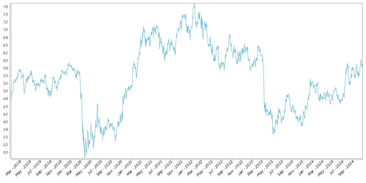 The following graph sets forth the daily historical performance of the KRE in the period from January 2, 2019 through the pricing date. We obtained this historical data from Bloomberg L.P. We have not independently verified the accuracy or completeness of the information obtained from Bloomberg L.P. On the pricing date, the Closing Market Price of the KRE was $57.90.
