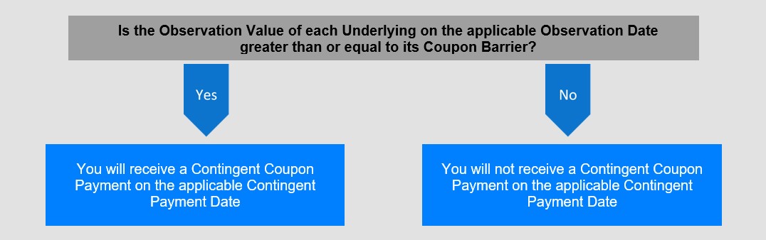 If, on any quarterly Observation Date, the Observation Value of each Underlying is greater than or equal to its Coupon Barrier, we will pay a Contingent Coupon Payment of $23.75 per $1,000.00 in principal amount of Notes (equal to a rate of 2.375% per quarter or 9.50% per annum) on the applicable Contingent Payment Date (including the Maturity Date). |
