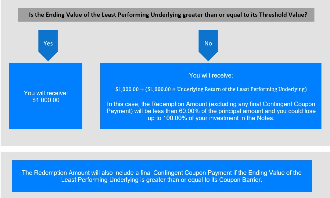 The Redemption Amount will also include a final Contingent Coupon Payment if the Ending Value of the Least Performing Underlying is greater than or equal to its Coupon Barrier. |