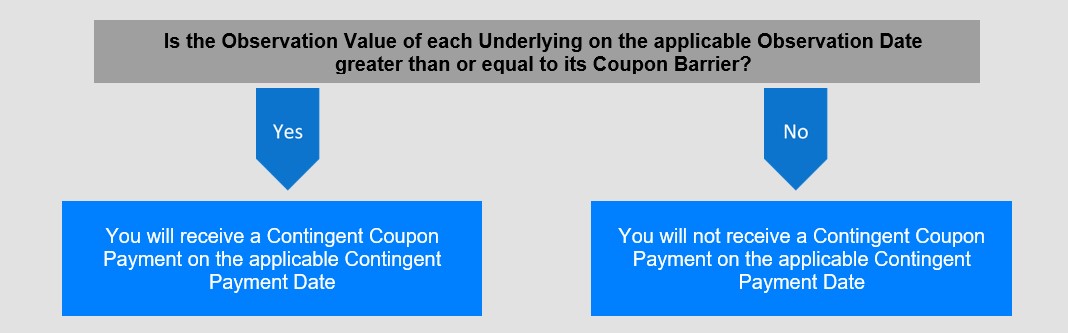 If, on any monthly Observation Date, the Observation Value of each Underlying is greater than or equal to its Coupon Barrier, we will pay a Contingent Coupon Payment of $6.25 per $1,000.00 in principal amount of Notes (equal to a rate of 0.625% per month or 7.50% per annum) on the applicable Contingent Payment Date (including the Maturity Date).