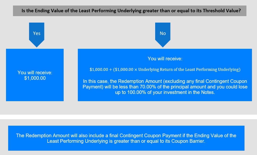 The Redemption Amount will also include a final Contingent Coupon Payment if the Ending Value of the Least Performing Underlying is greater than or equal to its Coupon Barrier.