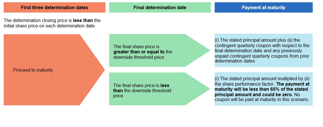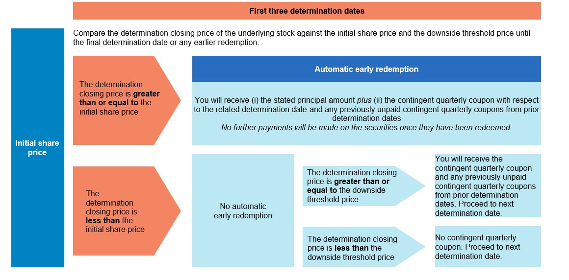 If, on any of the first three determination dates, the determination closing price of the underlying stock is greater than or equal to the initial share price, the securities will be automatically redeemed for an early redemption payment on the third business day following the related determination date, as set forth under “Determination Dates, Contingent Payment Dates and Early Redemption Dates” below. No further payments will be made on the securities once they have been redeemed.