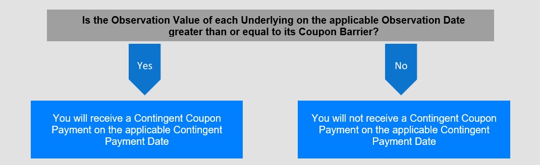 If, on any monthly Observation Date, the Observation Value of each Underlying is greater than or equal to its Coupon Barrier, we will pay a Contingent Coupon Payment of $5.917 per $1,000.00 in principal amount of Notes (equal to a rate of 0.5917% per month or 7.10% per annum) on the applicable Contingent Payment Date (including the Maturity Date).
