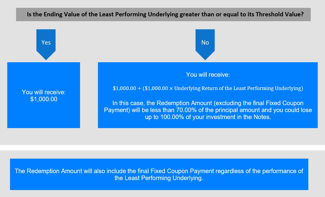 The Redemption Amount will also include the final Fixed Coupon Payment regardless of the performance of the Least Performing Underlying.