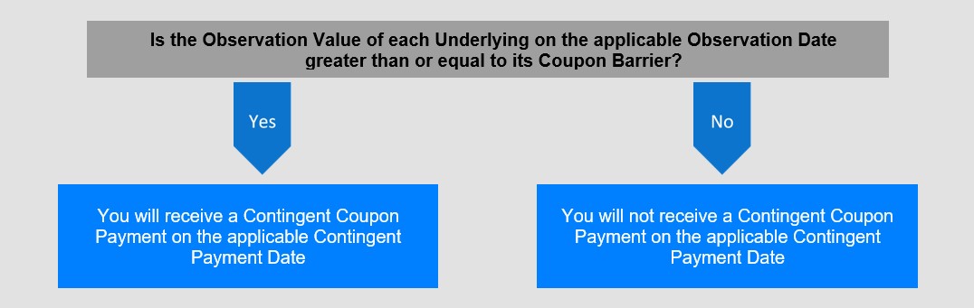 If, on any monthly Observation Date, the Observation Value of each Underlying is greater than or equal to its Coupon Barrier, we will pay a Contingent Coupon Payment of $7.50 per $1,000.00 in principal amount of Notes (equal to a rate of 0.75% per month or 9.00% per annum) on the applicable Contingent Payment Date (including the Maturity Date). |