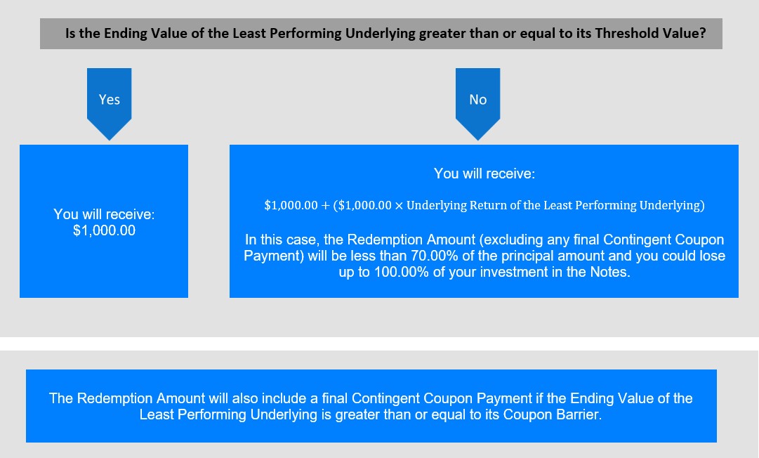 The Redemption Amount will also include a final Contingent Coupon Payment if the Ending Value of the Least Performing Underlying is greater than or equal to its Coupon Barrier. |