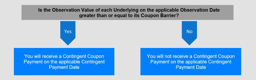 If, on any monthly Observation Date, the Observation Value of each Underlying is greater than or equal to its Coupon Barrier, we will pay a Contingent Coupon Payment of $5.834 per $1,000.00 in principal amount of Notes (equal to a rate of 0.5834% per month or 7.00% per annum) on the applicable Contingent Payment Date (including the Maturity Date).