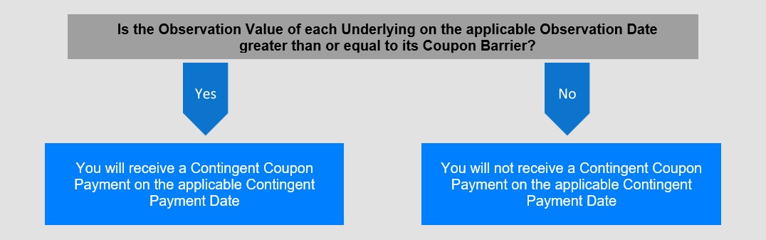 If, on any monthly Observation Date, the Observation Value of each Underlying is greater than or equal to its Coupon Barrier, we will pay a Contingent Coupon Payment of $5.417 per $1,000.00 in principal amount of Notes (equal to a rate of 0.5417% per month or 6.50% per annum) on the applicable Contingent Payment Date (including the Maturity Date). |